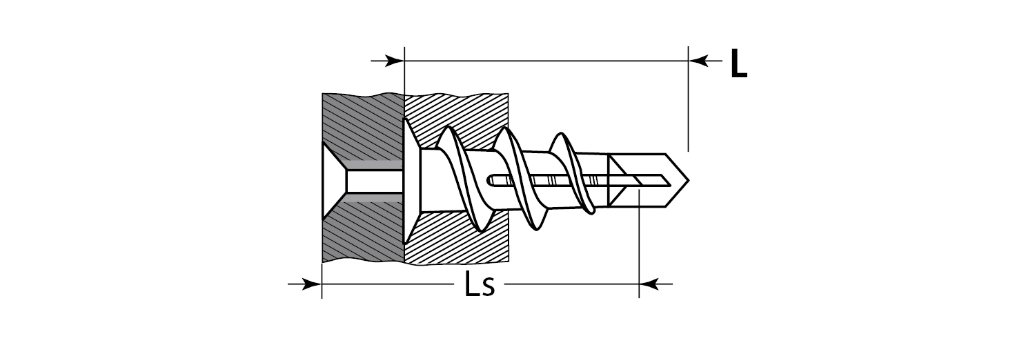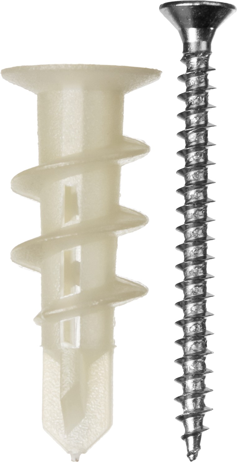 - Высокая резьба с крупным шагом увеличивает площадь контакта и фиксирует дюбель в гипсокартоне, не разрушая его.