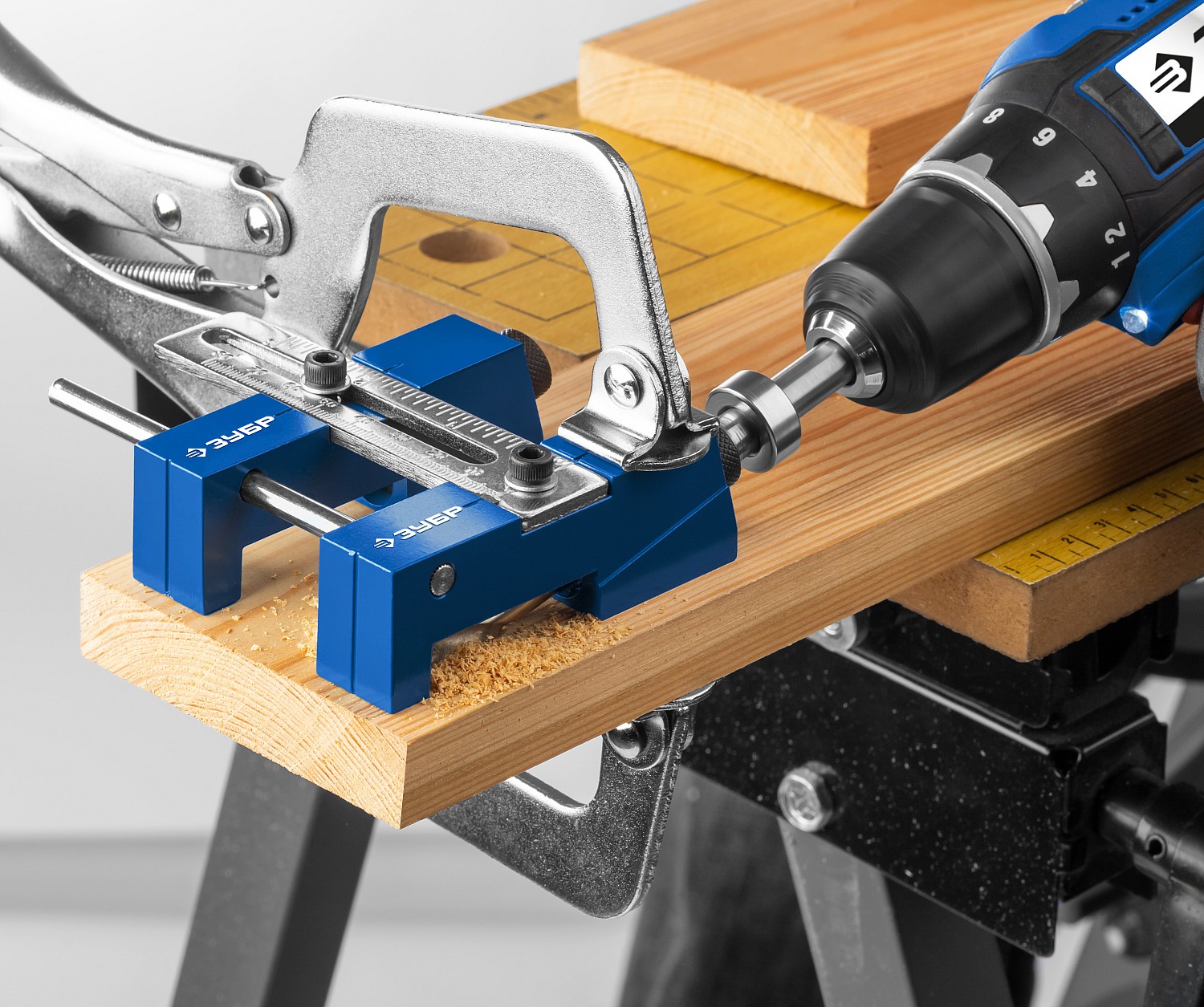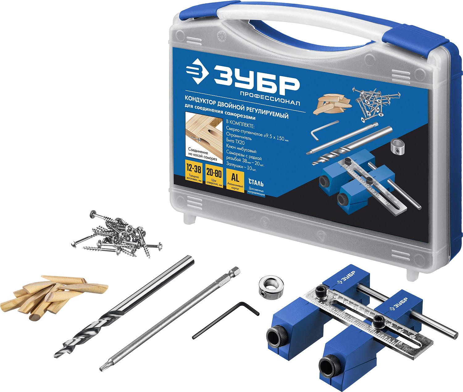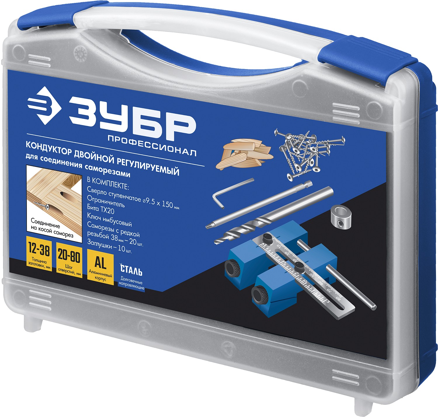 Использование кондукторов значительно упрощает процесс соединения деревянных деталей. Кондуктор предназначен для сверления глухих отверстий и точно позиционирует ступенчатое сверло. Глухое отверстие имеет внутри специальный профиль - больший диаметр на входе, ступенька, меньший диаметр на выходе. Ступенька в глубине глухого отверстия служит опорной поверхностью для головки самореза, обеспечивая прочное соединение деталей. Достаточно просверлить отверстия только в одной из соединяемых деталей и стянуть детали специальными саморезами для глухих отверстий. При выборе самореза нужно учитывать толщину соединяемых деталей.