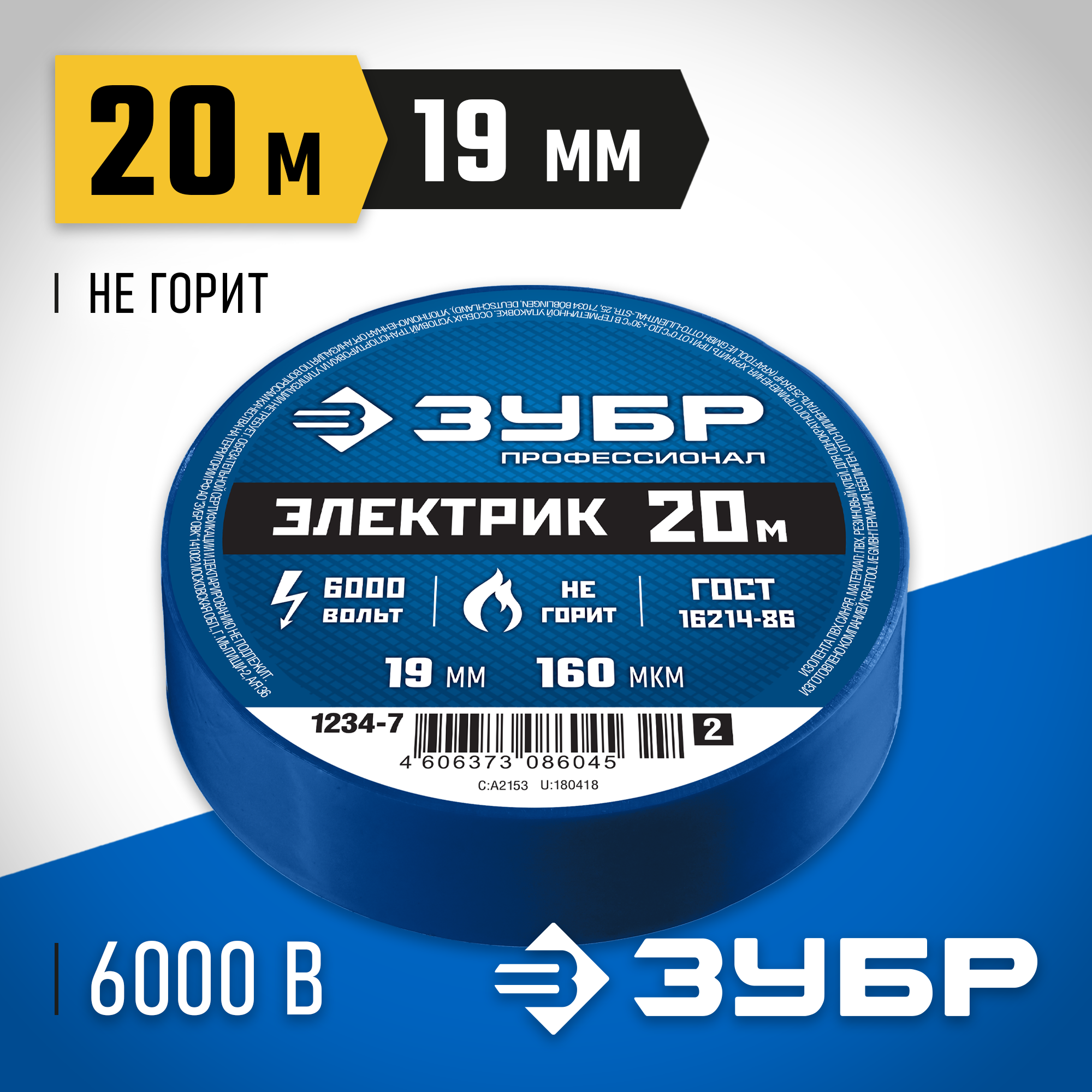 ЗУБР ЭЛЕКТРИК-20, 19 мм х 20 м, 6 000 В, синяя, не поддерживает горение, изолента ПВХ, Профессионал (1234-7)