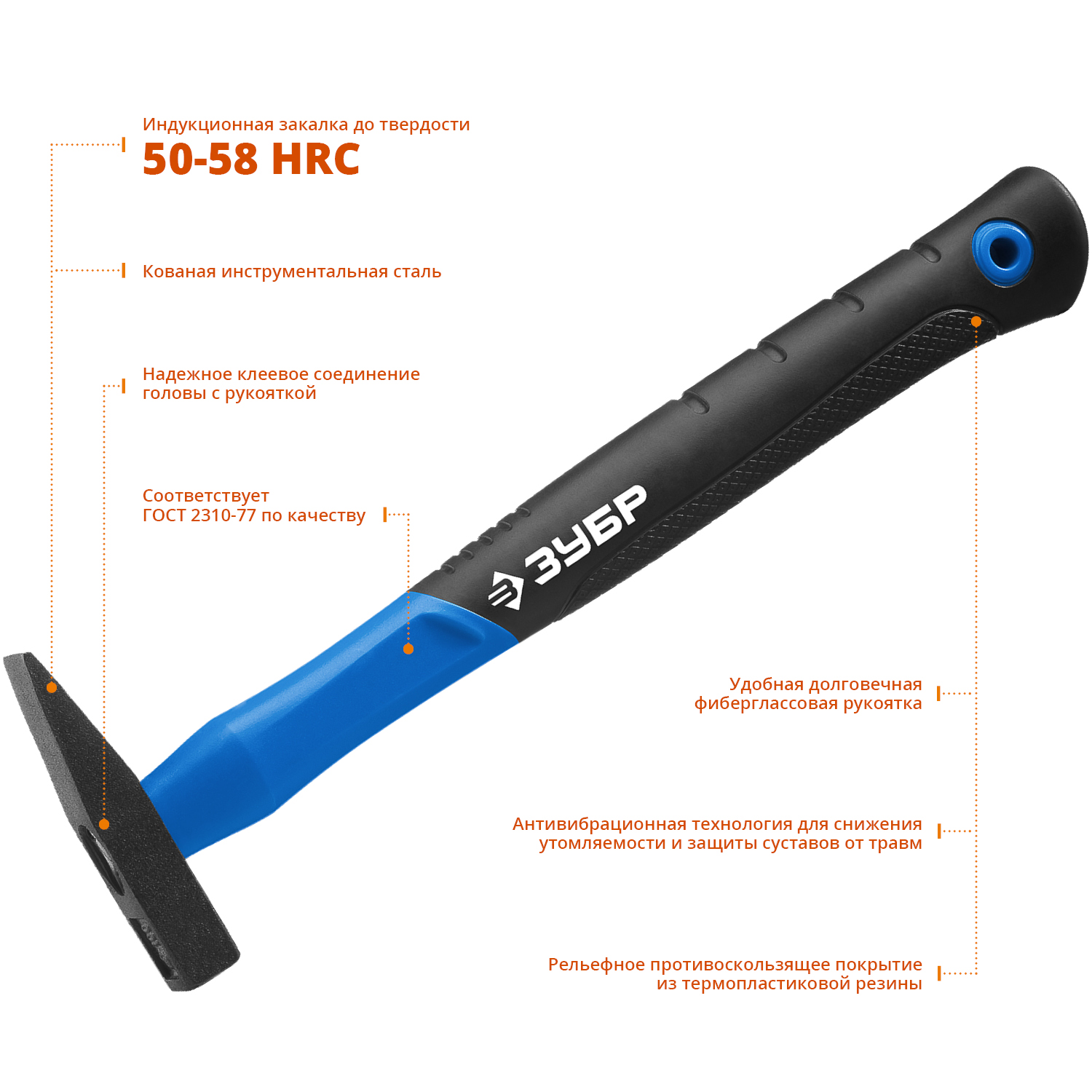 Молоток ЗУБР ПРОФЕССИОНАЛ оснащен особопрочной фибергласовой рукояткой. АВТ - технология позволяет существенно снизить вибрации, возникающие во время удара, что делает работу с инструментом более комфортной. Соответствует требованиям ГОСТ 2310-77.