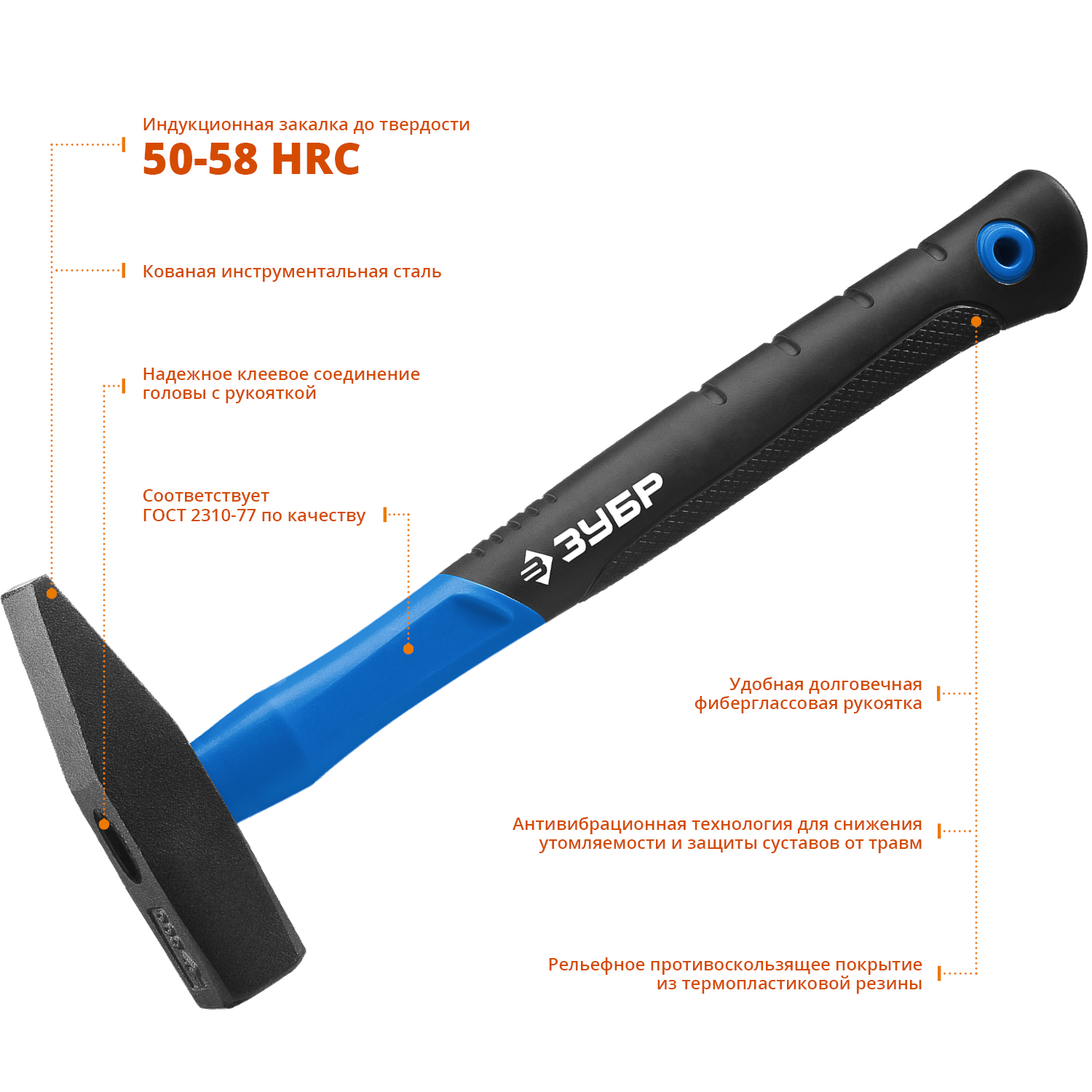 Молоток ЗУБР ПРОФЕССИОНАЛ оснащен особопрочной фибергласовой рукояткой. АВТ - технология позволяет существенно снизить вибрации, возникающие во время удара, что делает работу с инструментом более комфортной. Соответствует требованиям ГОСТ 2310-77.