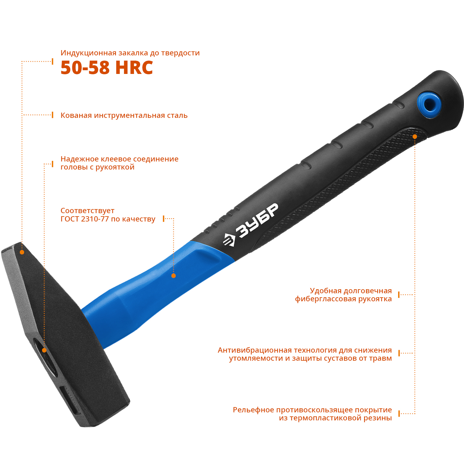 Молоток ЗУБР ПРОФЕССИОНАЛ оснащен особопрочной фибергласовой рукояткой. АВТ - технология позволяет существенно снизить вибрации, возникающие во время удара, что делает работу с инструментом более комфортной. Соответствует требованиям ГОСТ 2310-77.