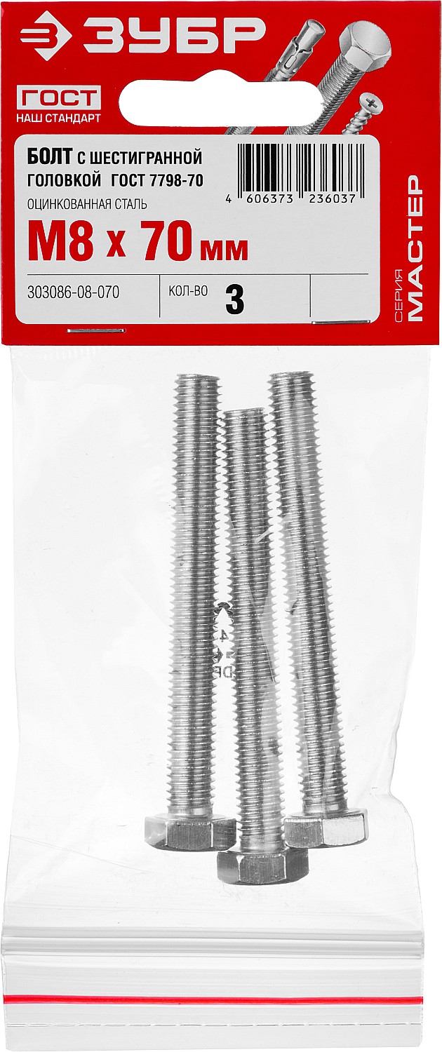 ЗУБР ГОСТ 7798-70, кл. пр. 5.8, M8 х 70 мм, цинк, 3 шт, болт (303086-08-070)