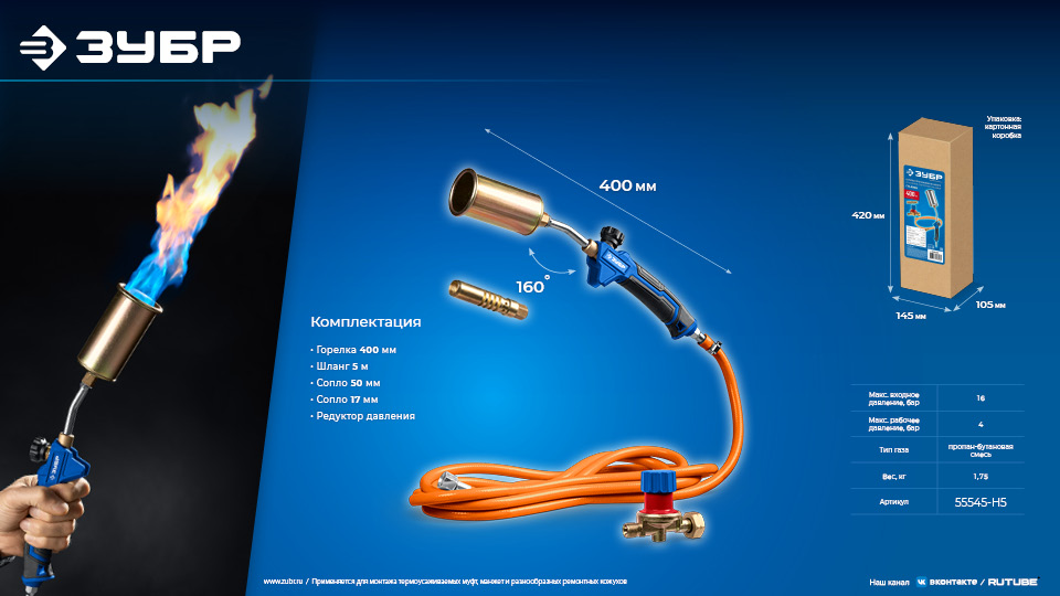Газовые горелки ЗУБР обладают возможностью выбора температурного режима, что позволяет максимально соответствовать требованиям любой работы. Используются для монтажа термоусаживаемых муфт, манжет и разнообразных ремонтных кожухов. Насадка для пайки позволяет использовать прибор для монтажа заземляющего провода.