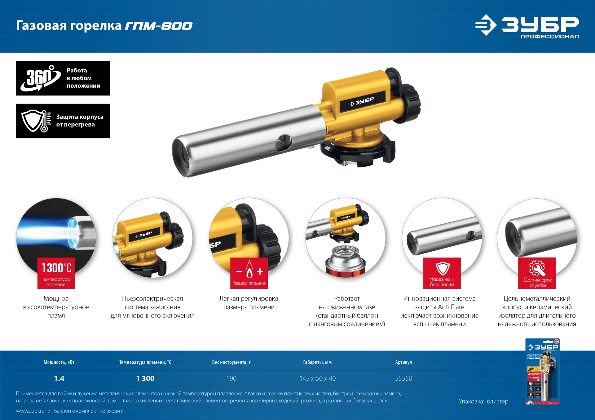 Газовая горелка обладает возможностью выбора температурного режима, что позволяет максимально соответствовать требованиям любой работы. Идеально подходит для лужения, прогрева и многих других работ. •Легкий подбор температурного режима, •Быстрый нагрев, •Мгновеное включение, благодаря встроенному пьезоподжигу, •Многофункциональность: один инструмент. множество возможностей. •Работает на жидком газе -бутан.