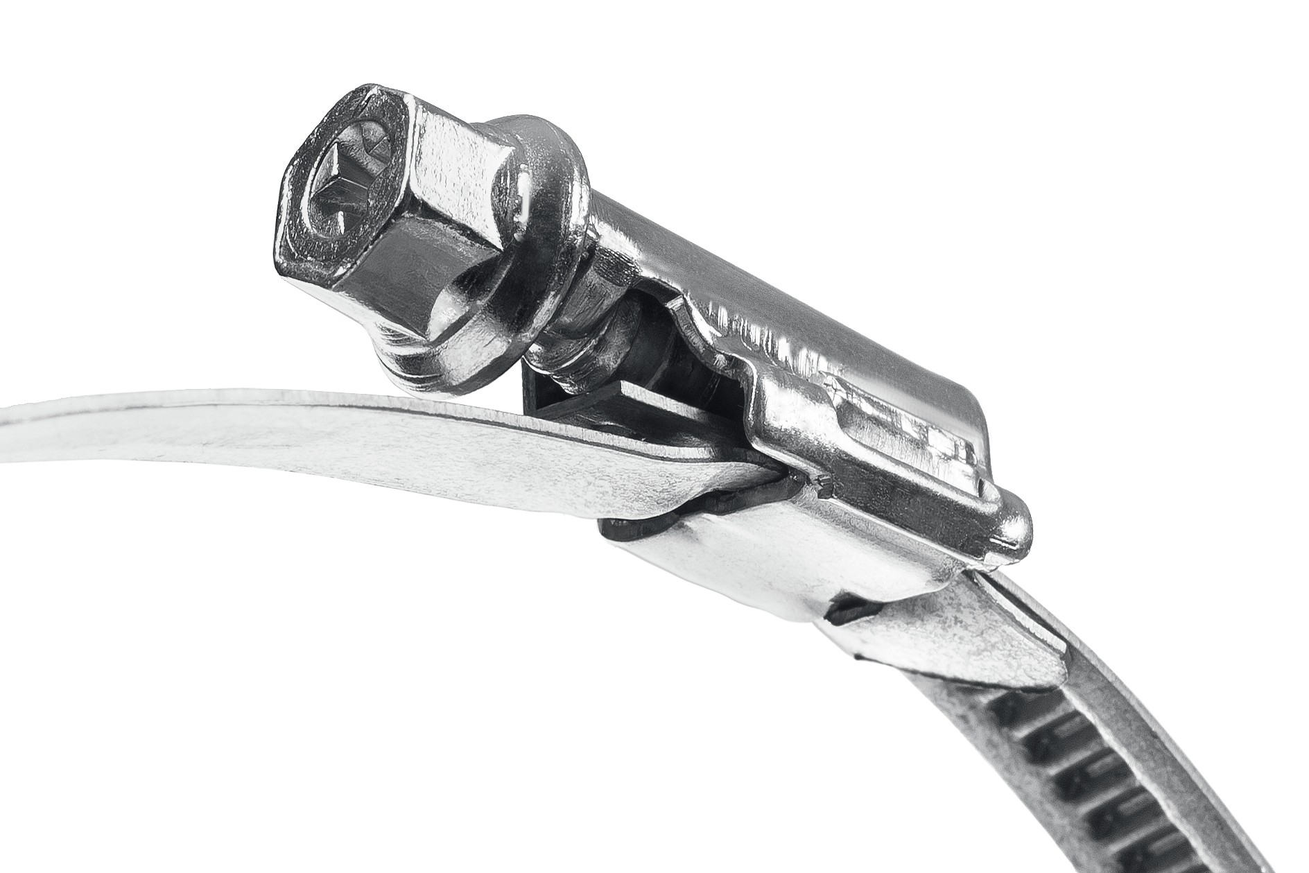 Червячный хомут состоит из штампованной ленты и винта с червячной резьбой. Накатная лента имеет гладкую внутреннюю поверхность, которая защищает шланг от повреждений. При вращении винта лента сжимается, благодаря чему создается надежное и герметичное соединение шлангов, различных труб, и т.д. Червячный винт снабжен шестигранной головкой под ключ 8 мм и шлицем PH, что позволяет использовать при монтаже гаечный ключ или шлицевую отвертку.