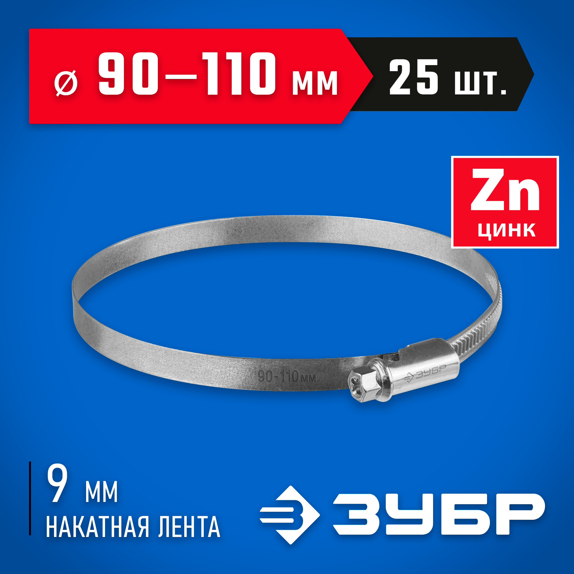 ЗУБР Х-9Н, 90 - 110 мм, накатная лента 9 мм, цинк, 25 шт, червячный хомут (37807-110)