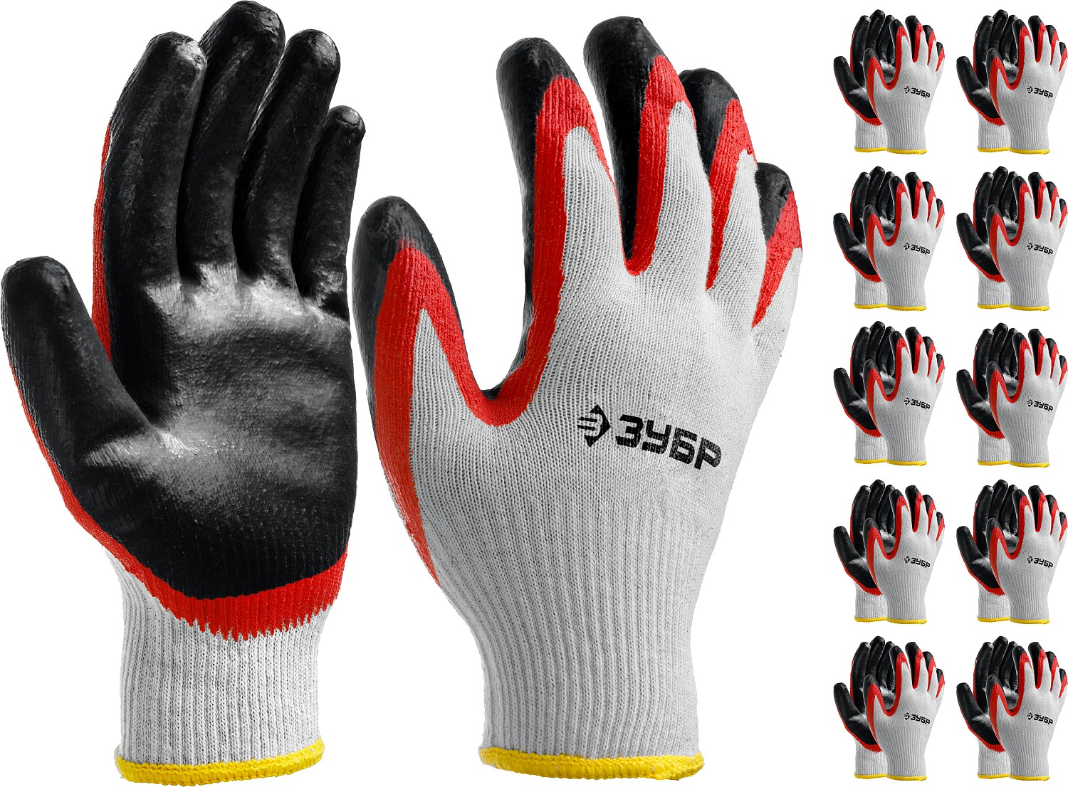ЗУБР х2 ЗАЩИТА, L-XL, х/б перчатки с двойным латексным обливом, повышенной износостойкости, 13 класс, 10 пар (11459-K10)