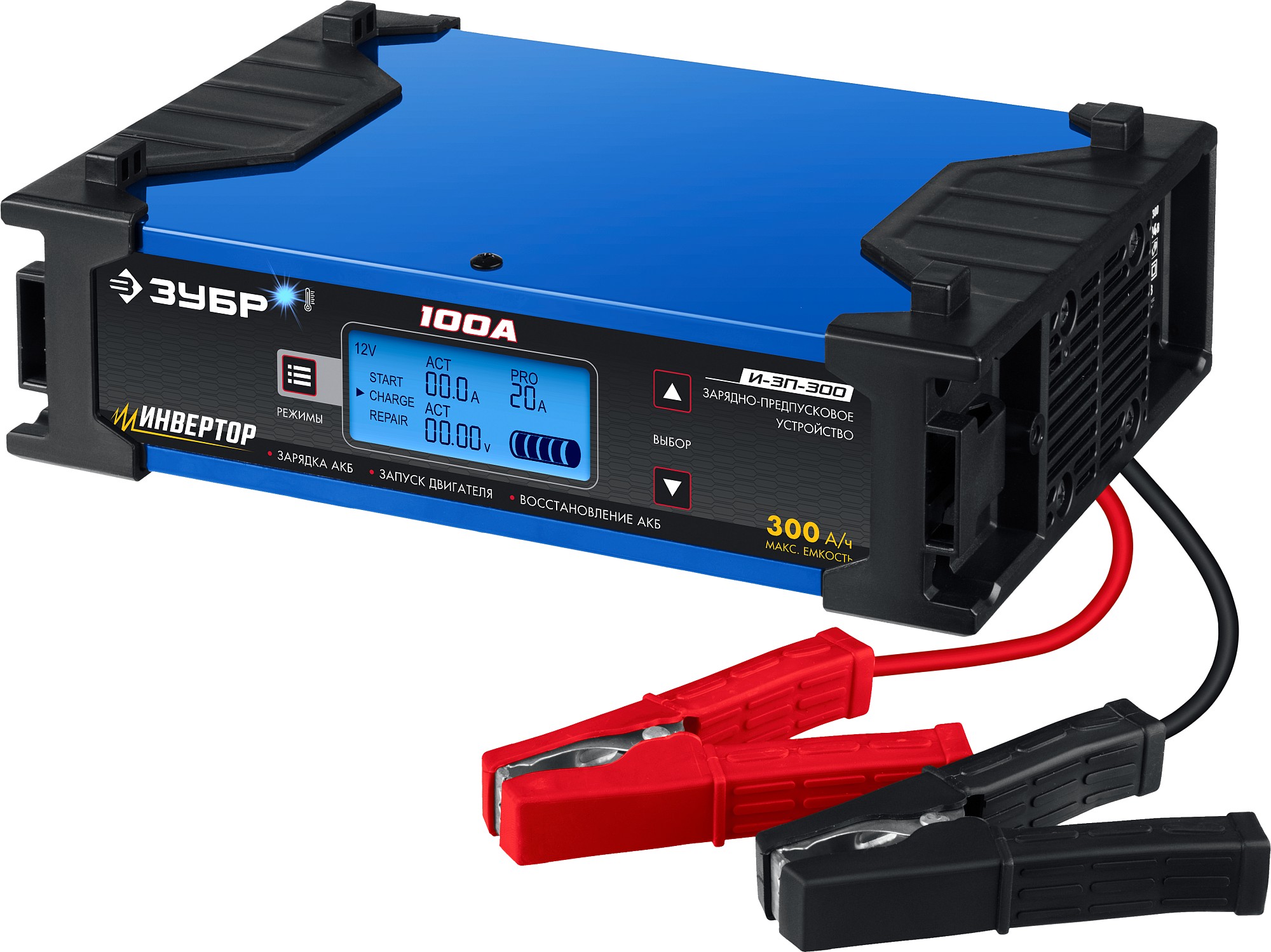 Инверторное зарядно-предпусковое устройство предназначено для зарядки аккумуляторных батарей легковых и грузовых автомобилей, мотоциклов, снегоходов, катеров (лодок), газонокосилок, тракторов, гидроциклов и т.д. Зарядные устройства ЗУБР управляются с помощью микропроцессора. Данные устройства обладают высокой эффективностью и имеют защиту от ошибок, которые может допустить пользователь. Микропроцессор зарядного устройства оценивает состояние батареи и соответствующим образом устанавливает силу зарядного тока и напряжение (в зависимости от типа АКБ и её состояния). Это позволяет наиболее эффективно зарядить аккумулятор и продлить срок его службы.