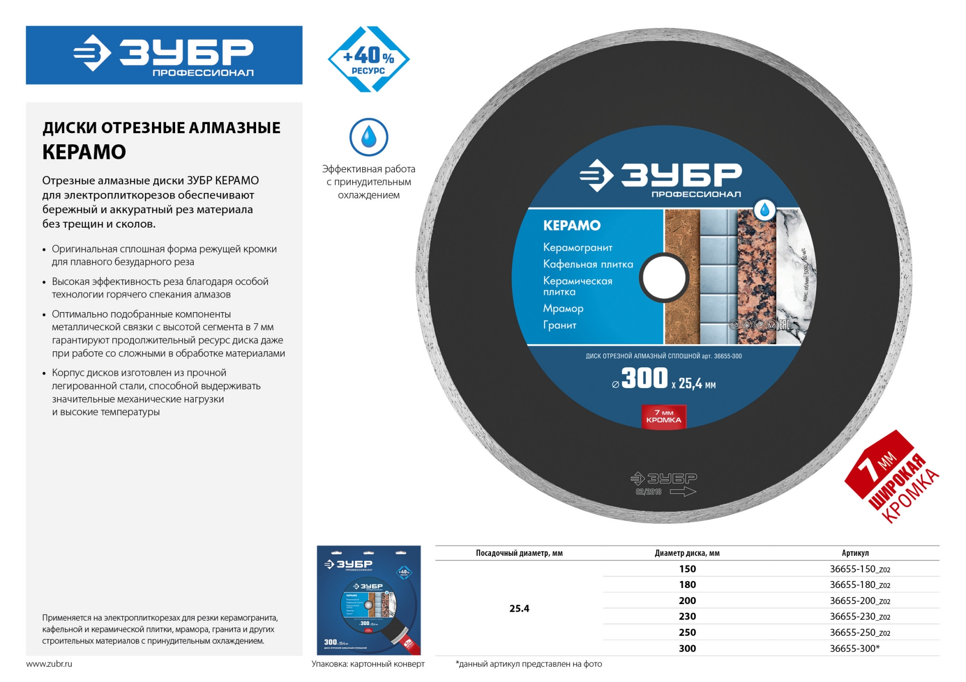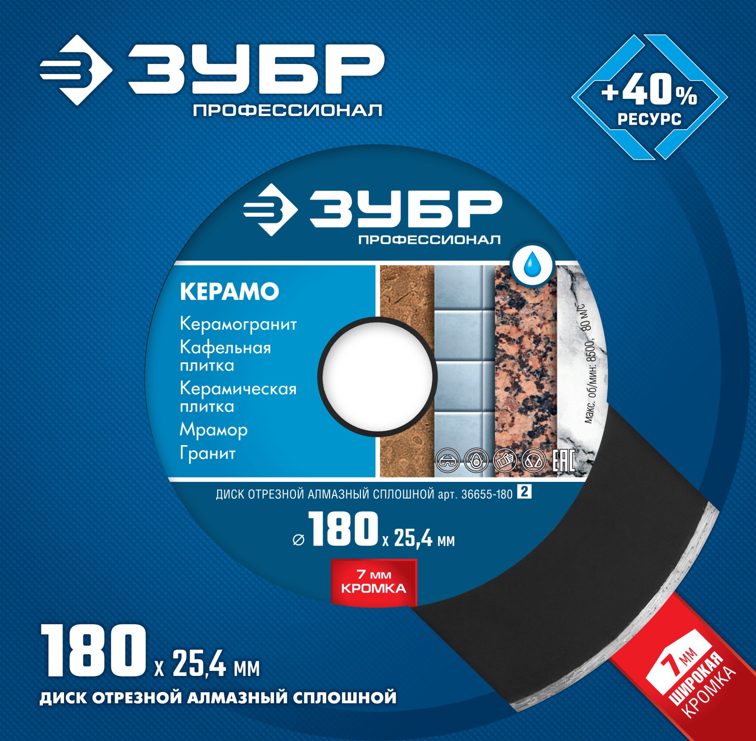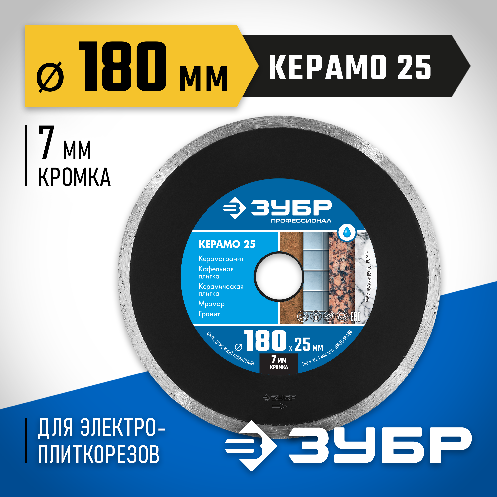 ЗУБР Керамо-25, d 180 мм, (25.4 мм, 7 х 2.2 мм), сплошной алмазный диск, Профессионал (36655-180)