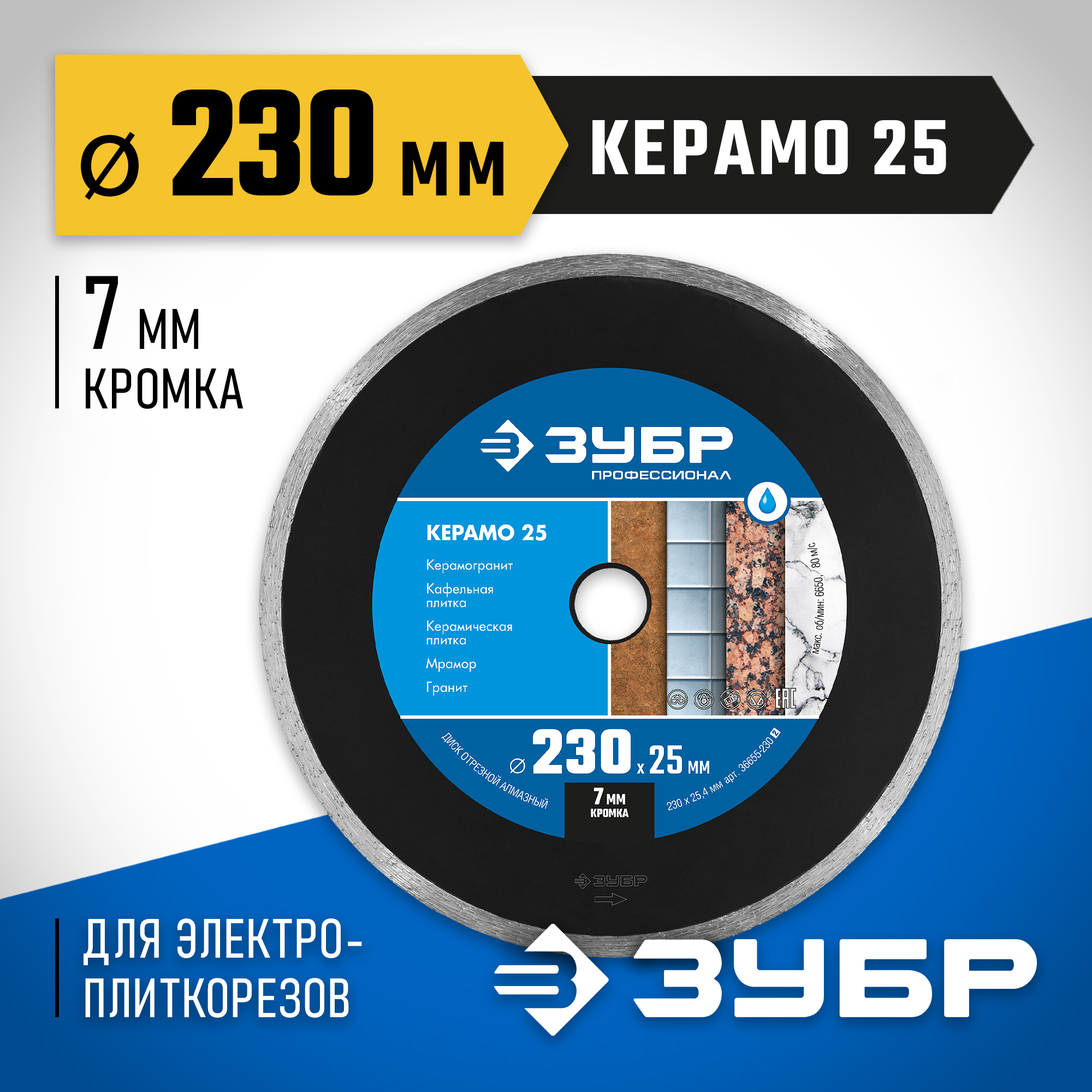 ЗУБР Керамо-25, d 230 мм, (25.4 мм, 7 х 2.4 мм), сплошной алмазный диск, Профессионал (36655-230)