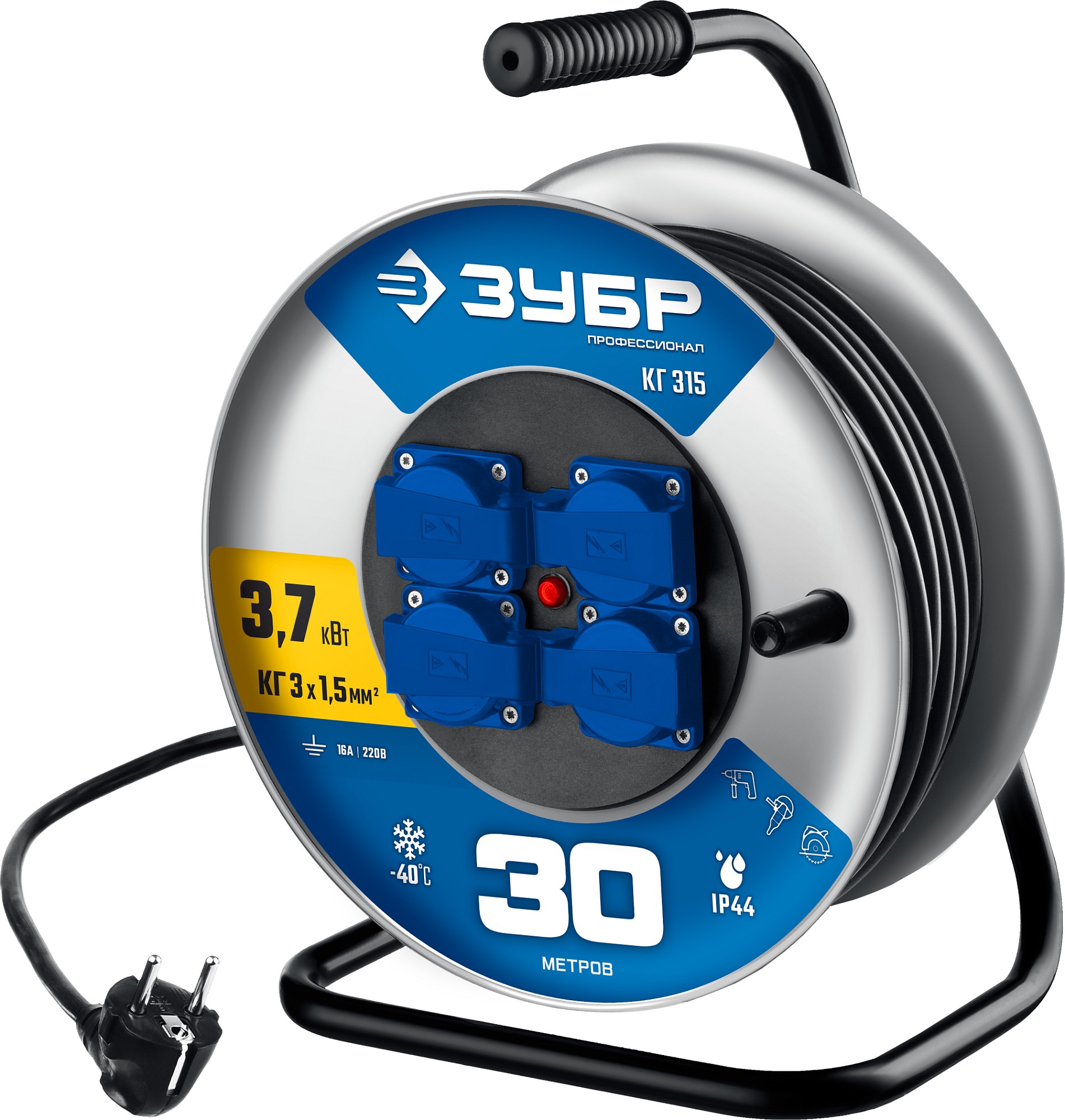 ЗУБР КГ-315, КГ, 3 x 1.5 мм2, 30 м, 3700 Вт, IP44, силовой удлинитель на стальной катушке, Профессионал (55080-30)