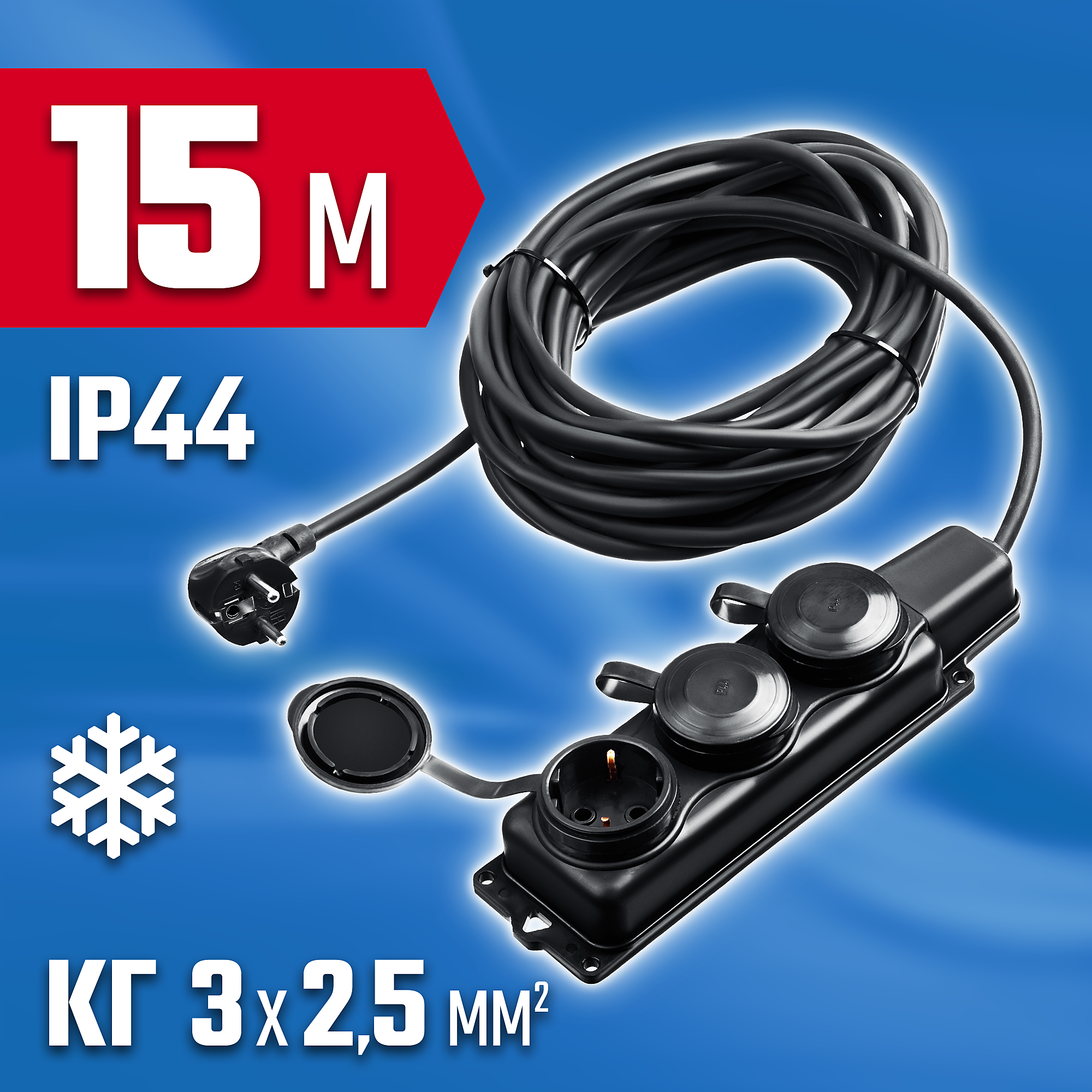 Удлинитель предназначен для подключения электрических приборов, которые находится на удалении от основного источника сети. Провод КГ (резиновая изоляция) устойчив к низким температурам до -40°С, к агрессивным средам, к деформациям и ударам. Позволяет выполнять работы в любое время года.