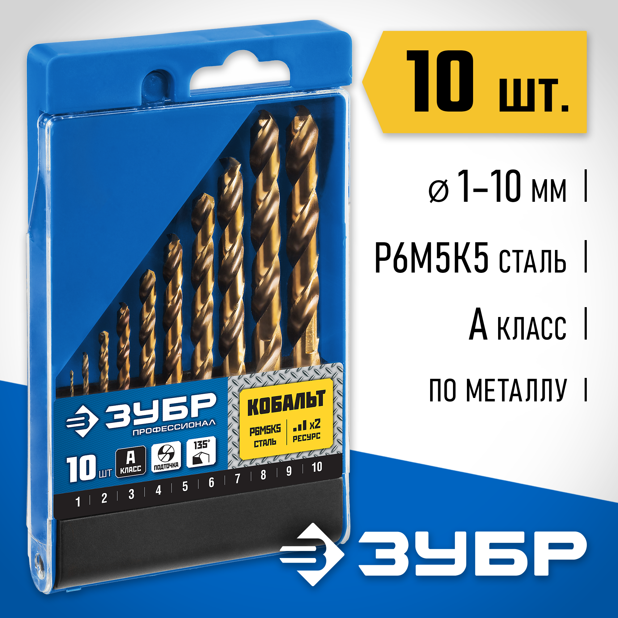 ЗУБР Кобальт, 10 шт, (1-10 мм), сталь Р6М5К5, класс А, набор сверл по металлу, Профессионал (29626-H10)