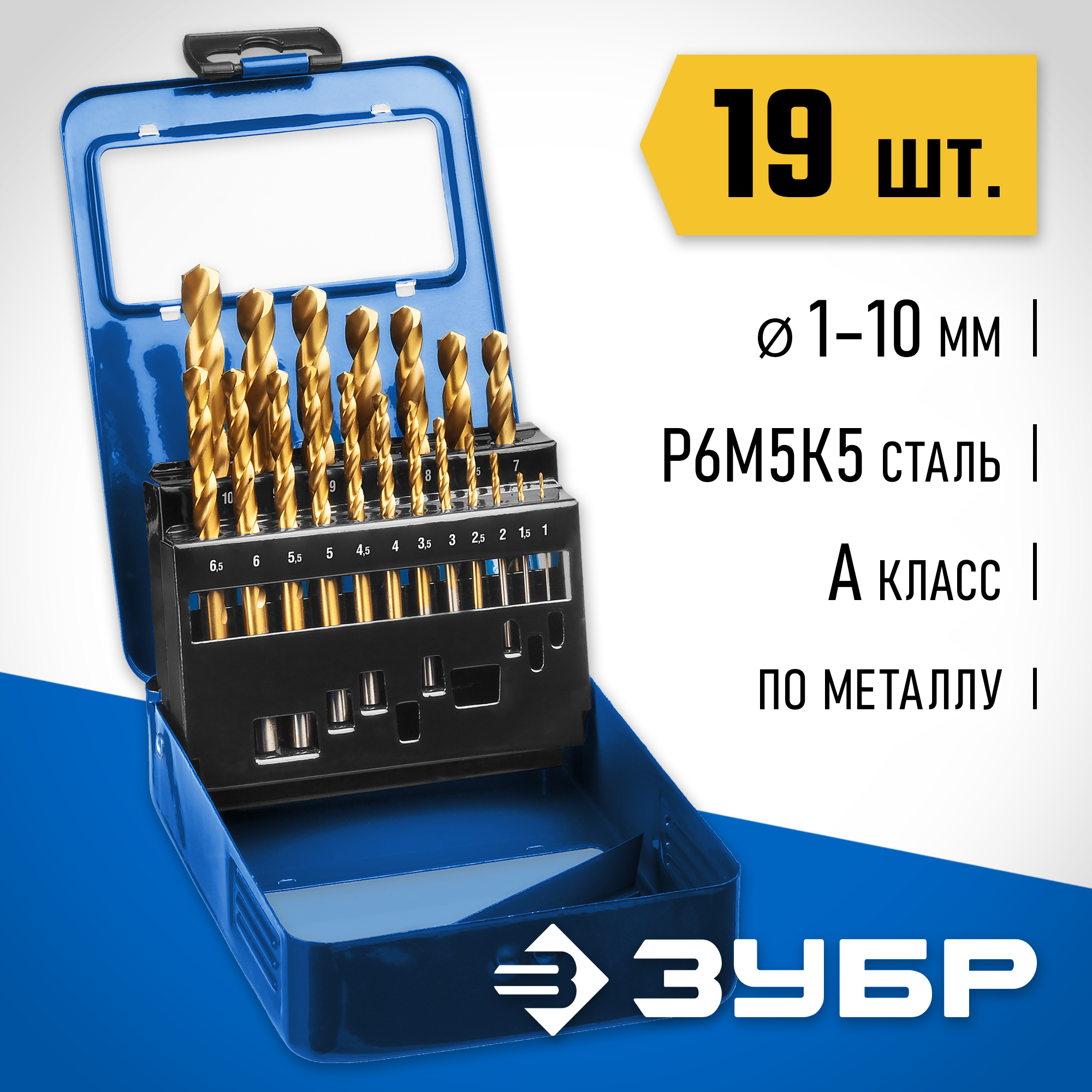 ЗУБР Кобальт, 19 шт, (1-10 мм), сталь Р6М5К5, класс А, мет.бокс, набор сверл по металлу, Профессионал (29626-H19)