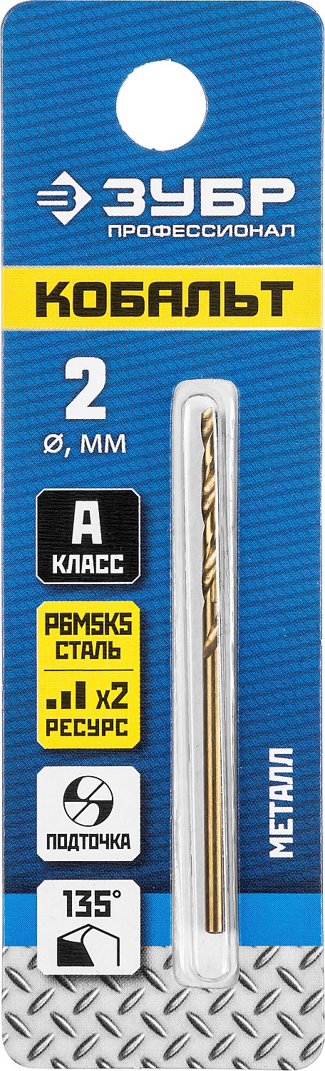 ЗУБР Кобальт, 2.0 х 49 мм, сталь Р6М5К5, класс А, сверло по металлу, Профессионал (29626-2)