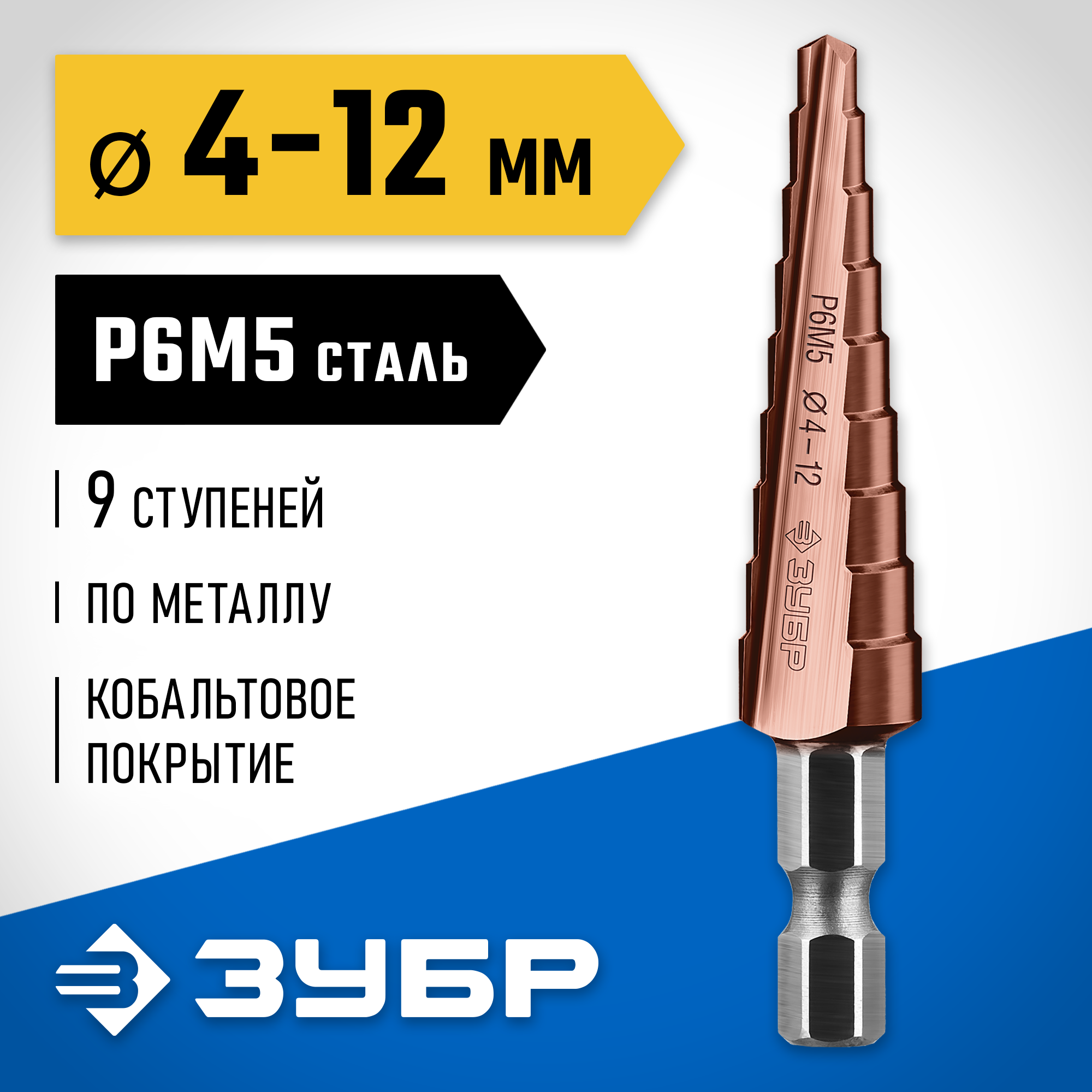 ЗУБР Кобальт, 4-12 мм, 9 ступеней, сталь Р6М5, кобальтовое покрытие, ступенчатое сверло, Профессионал (29672-4-12-9)