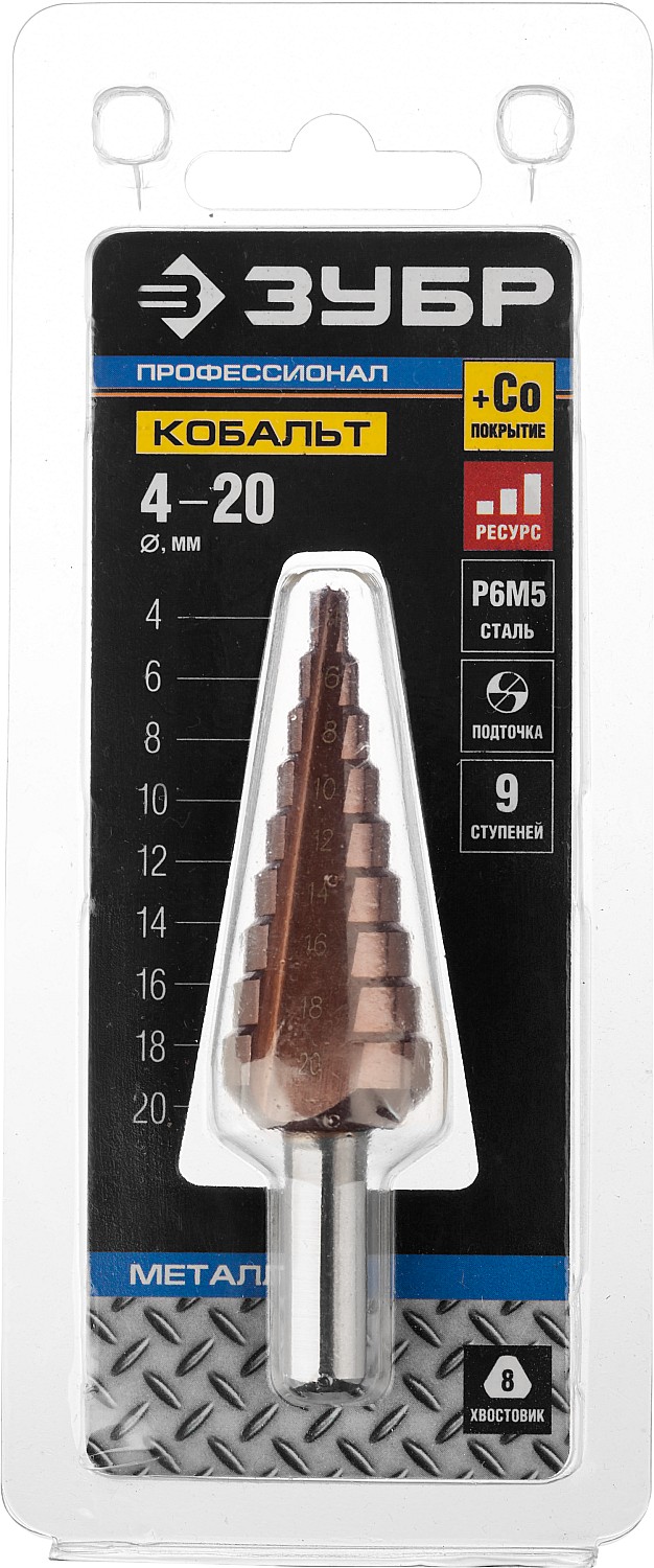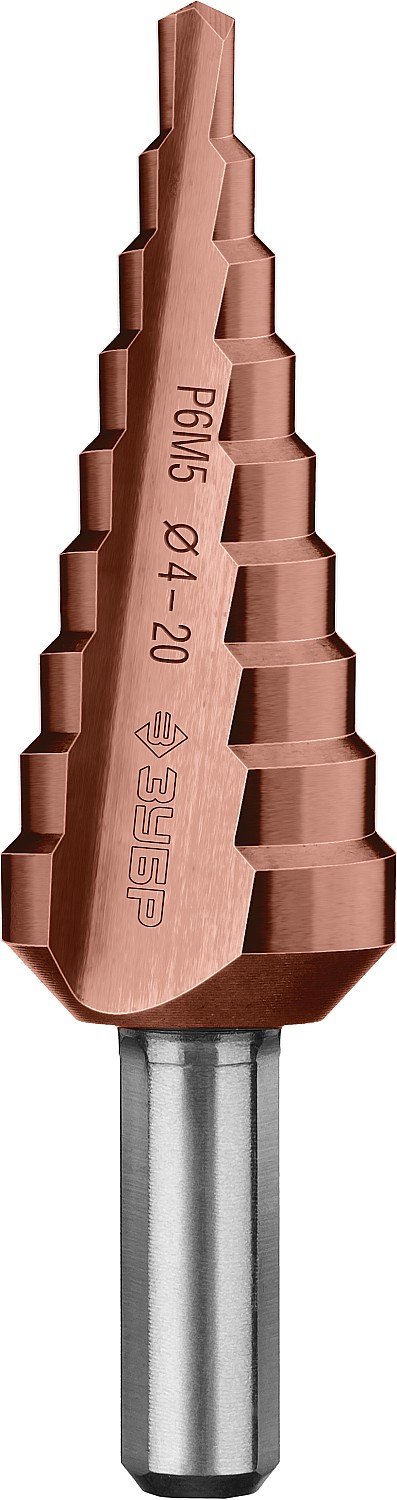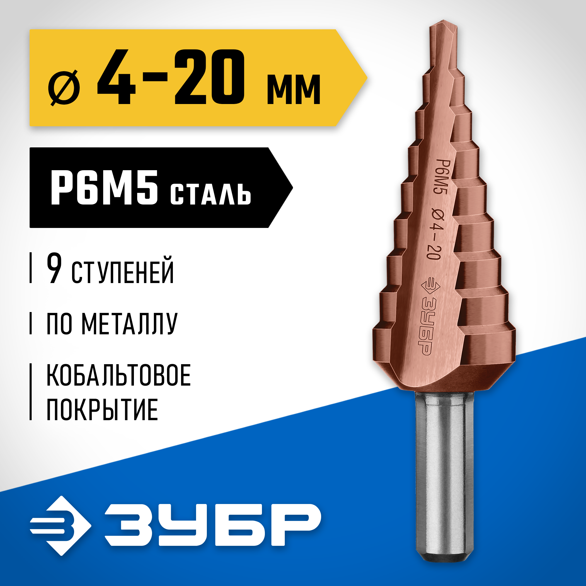 ЗУБР Кобальт, 4-20 мм, 9 ступеней, сталь Р6М5, кобальтовое покрытие, ступенчатое сверло, Профессионал (29672-4-20-9)