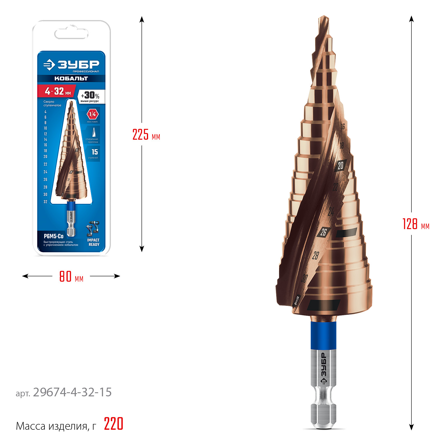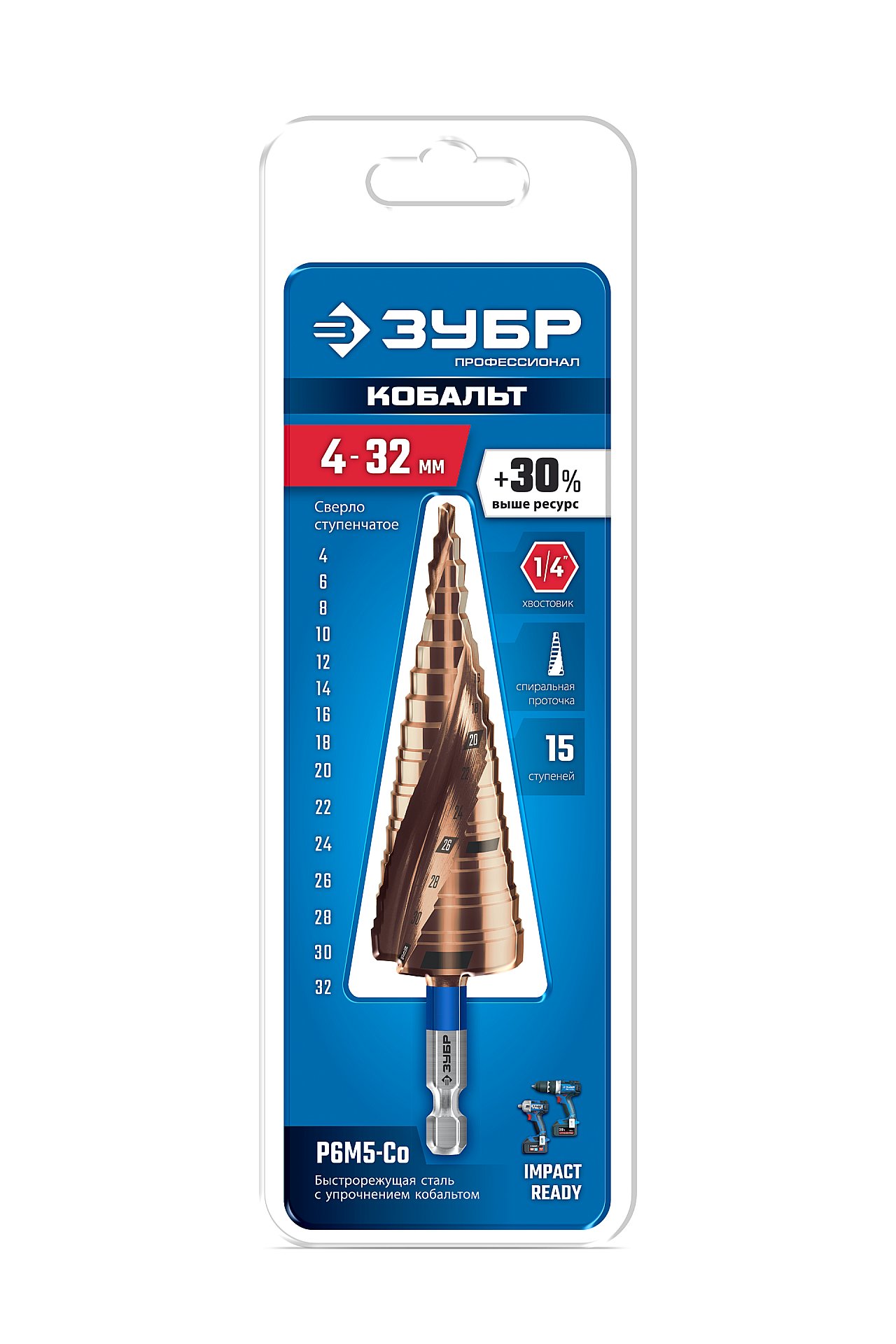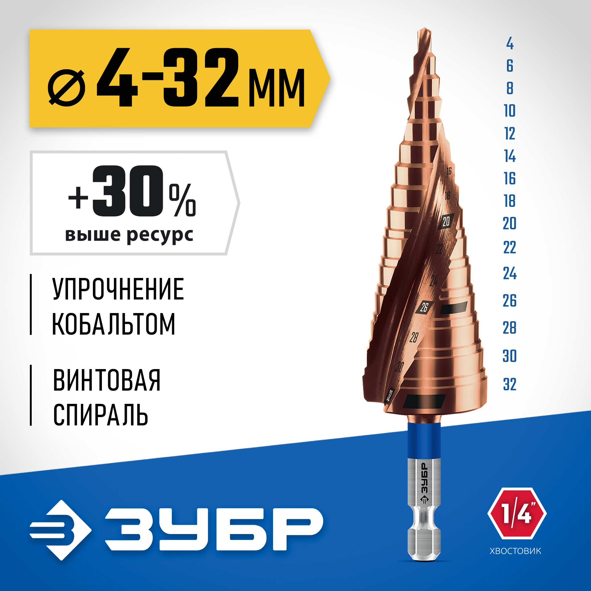 ЗУБР КОБАЛЬТ 4-32мм, 15 ступеней, винтовая проточка, сверло ступенчатое, ПРОФЕССИОНАЛ (29674-4-32-15)