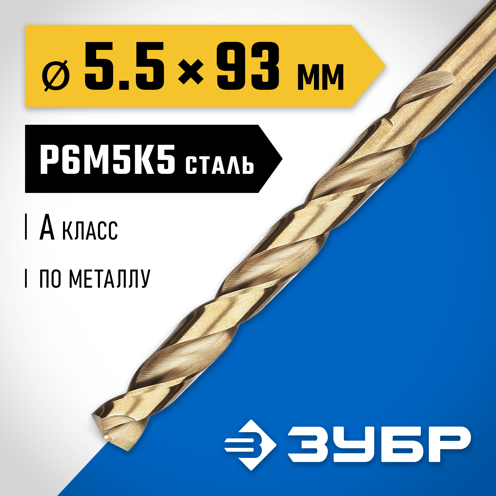 ЗУБР Кобальт, 5.5 х 93 мм, сталь Р6М5К5, класс А, сверло по металлу, Профессионал (29626-5.5)