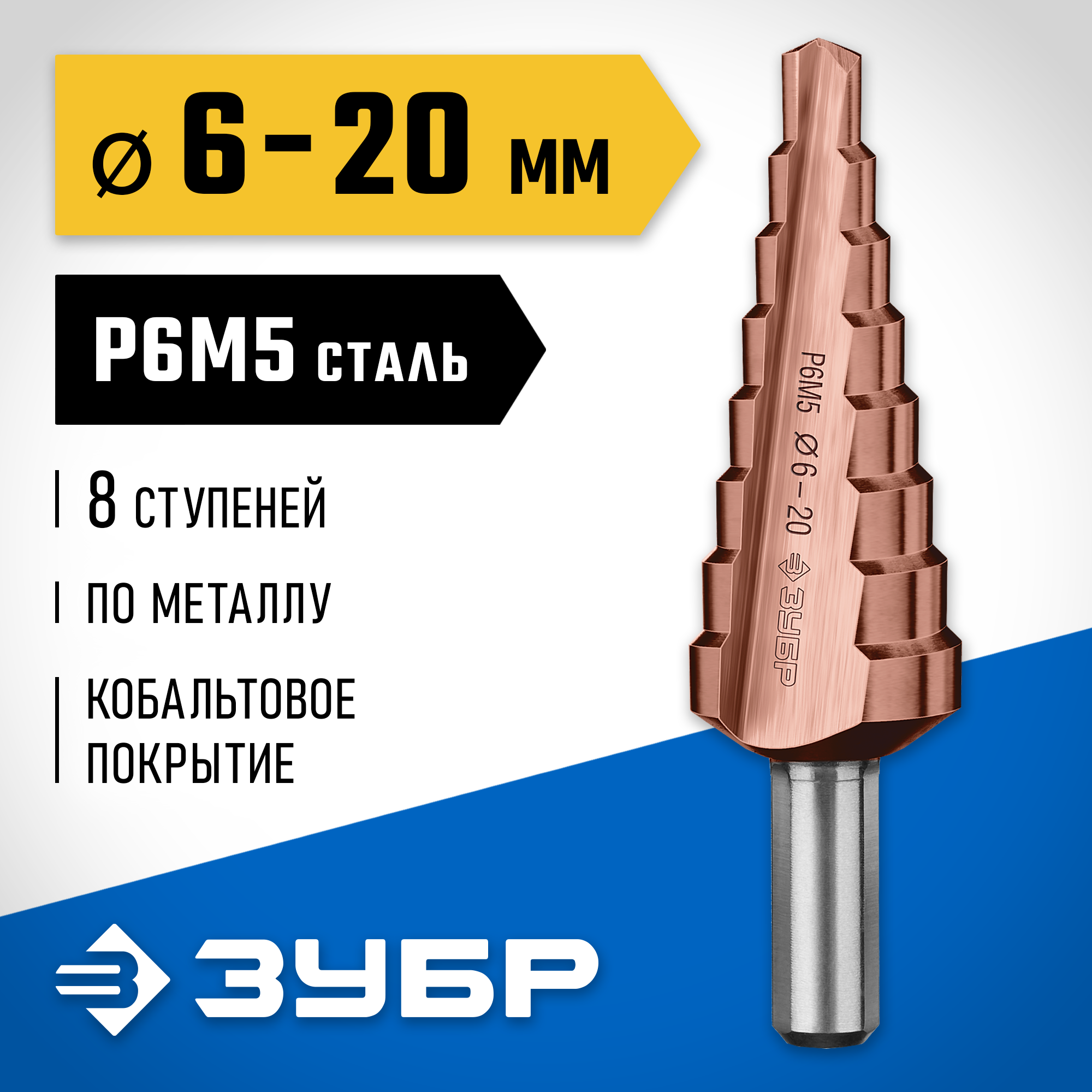ЗУБР Кобальт, 6-20 мм, 8 ступеней, сталь Р6М5, кобальтовое покрытие, ступенчатое сверло, Профессионал (29672-6-20-8)