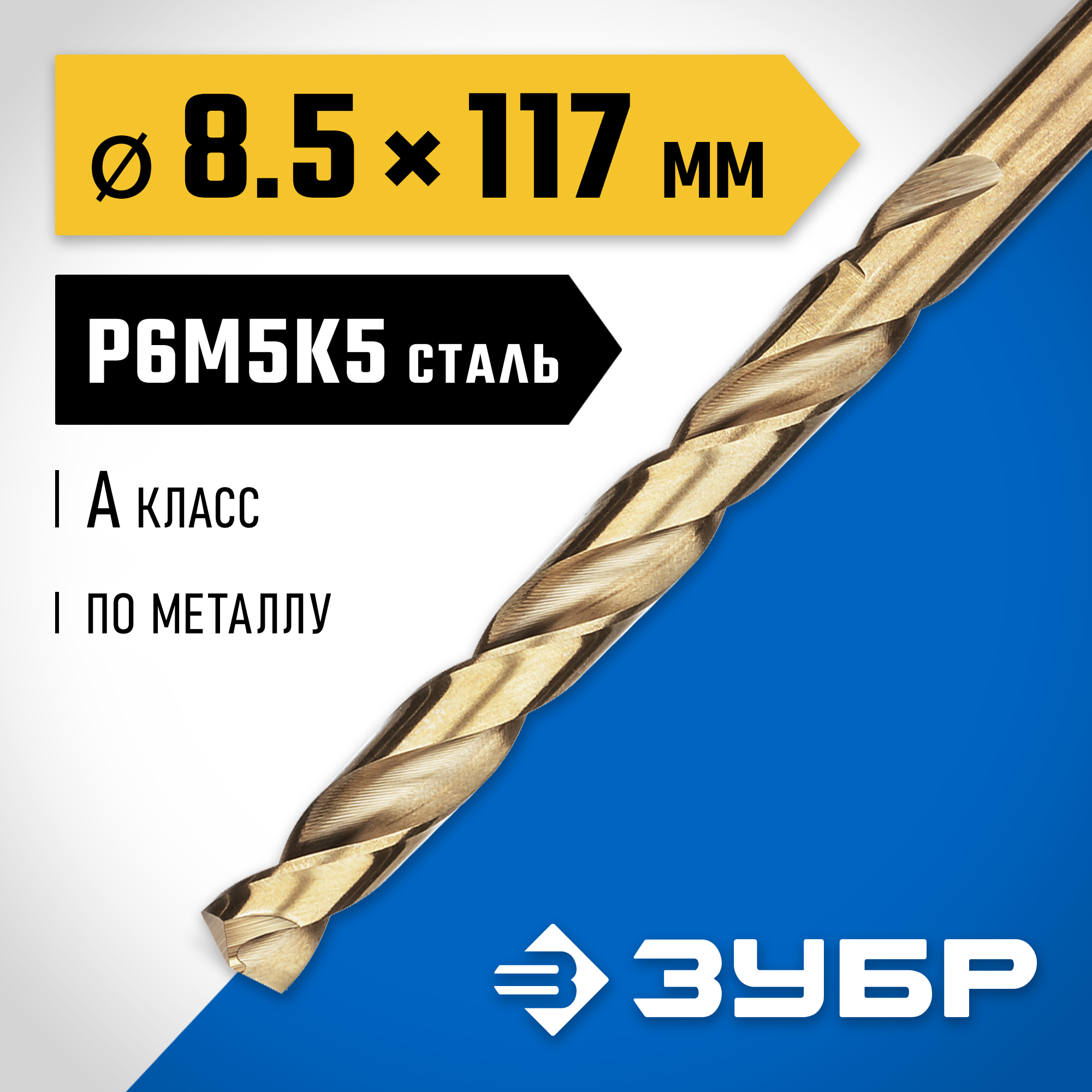 ЗУБР Кобальт, 8.5 х 117 мм, сталь Р6М5К5, класс А, сверло по металлу, Профессионал (29626-8.5)