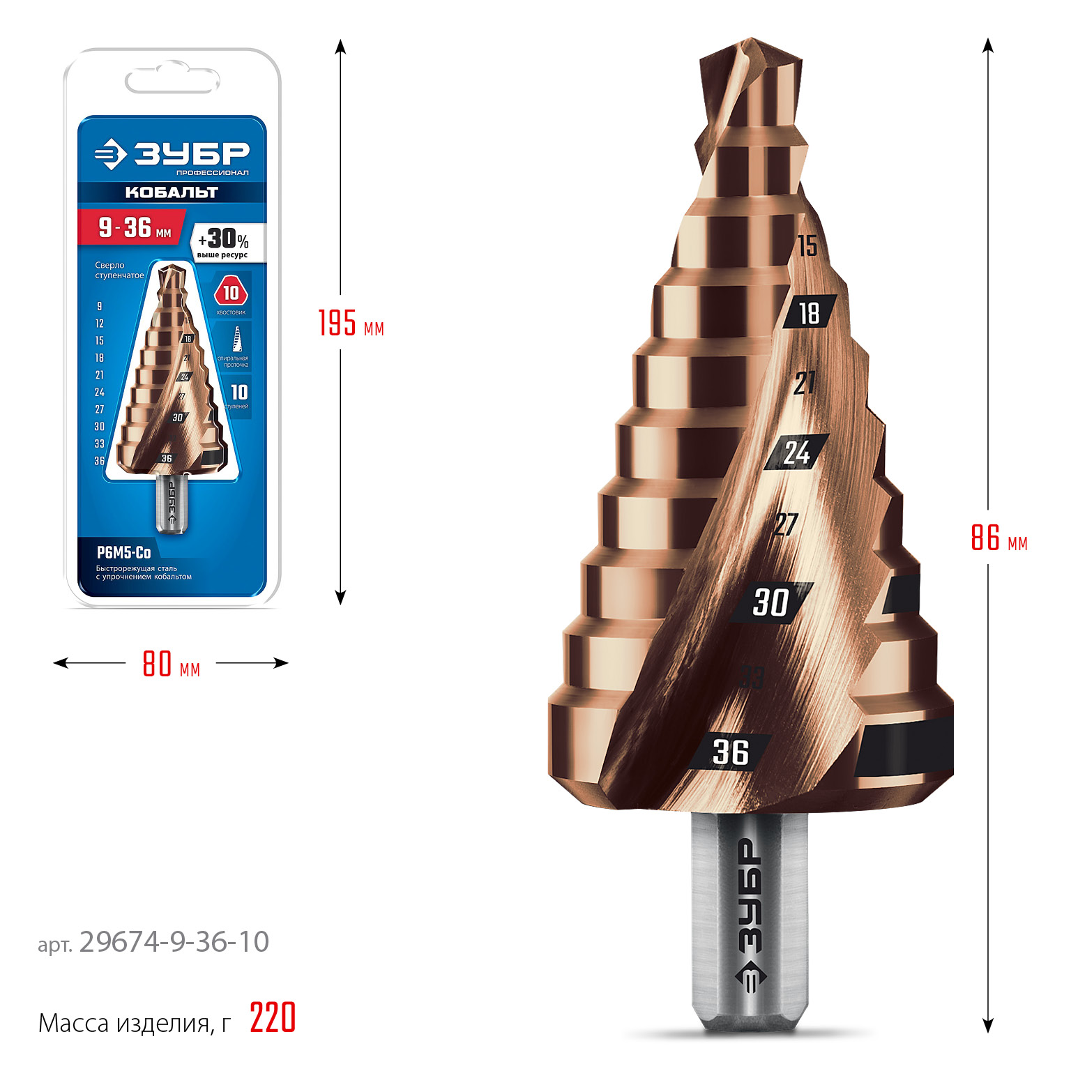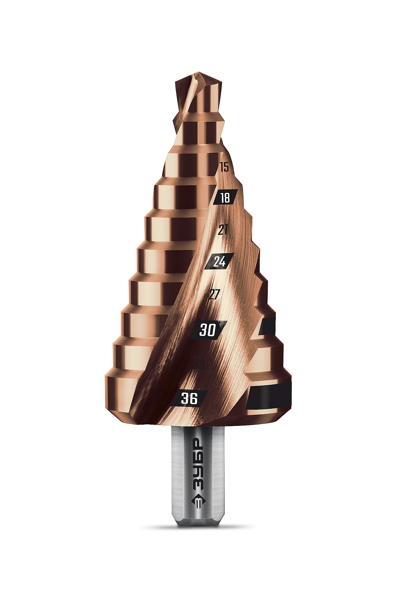 ЗУБР КОБАЛЬТ 9-36мм, 10 ступеней, винтовая проточка, сверло ступенчатое, ПРОФЕССИОНАЛ (29674-9-36-10)