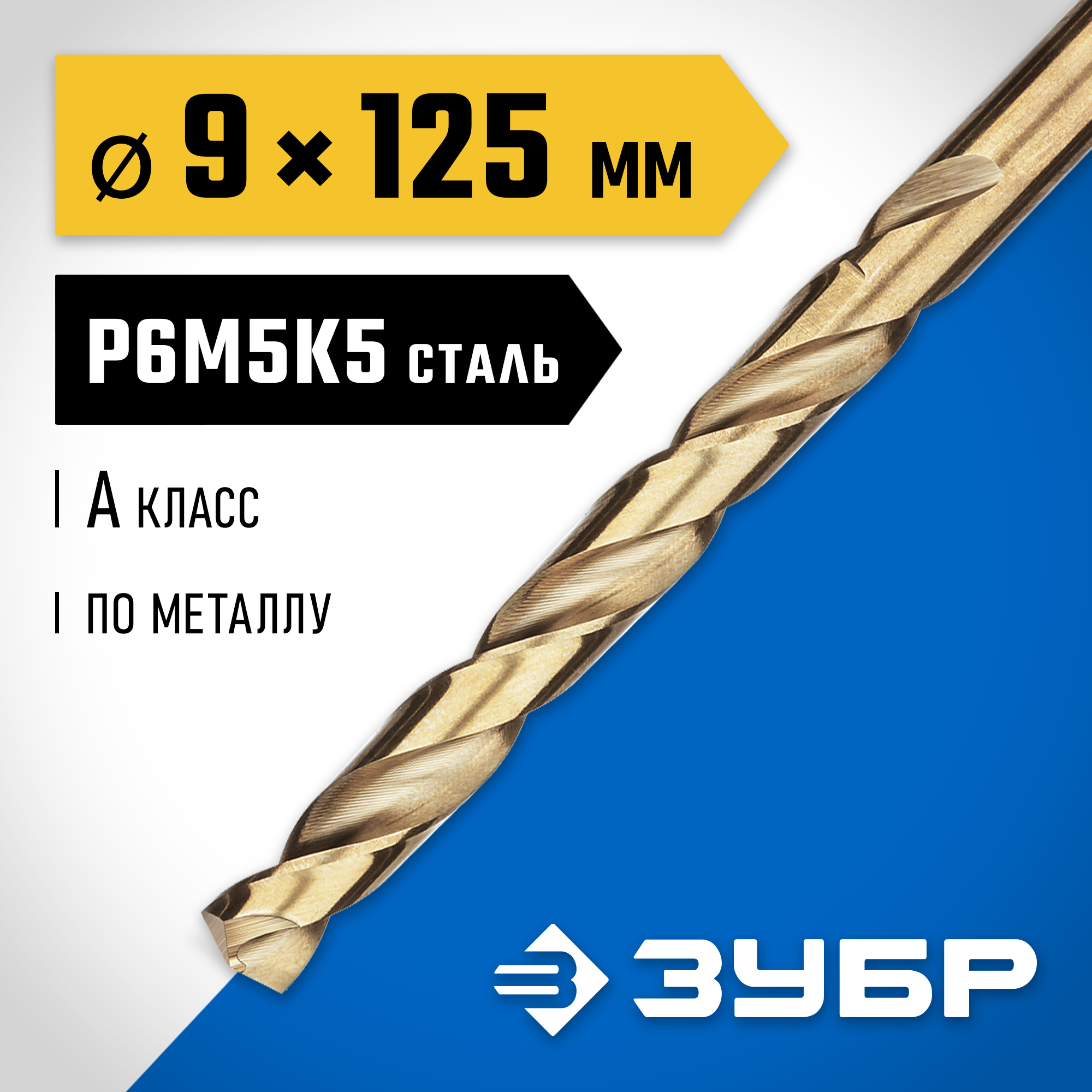 ЗУБР Кобальт, 9.0 х 125 мм, сталь Р6М5К5, класс А, сверло по металлу, Профессионал (29626-9)