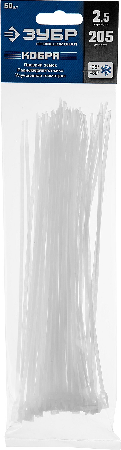 ЗУБР КОБРА, 2.5 x 205 мм, нейлон РА66, 50 шт, белые, кабельные стяжки с плоским замком, Профессионал (30930-25-205)
