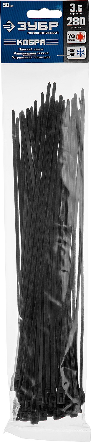 ЗУБР КОБРА, 3.6 x 280 мм, нейлон РА66, 50 шт, черные, кабельные стяжки с плоским замком, Профессионал (30935-36-280)