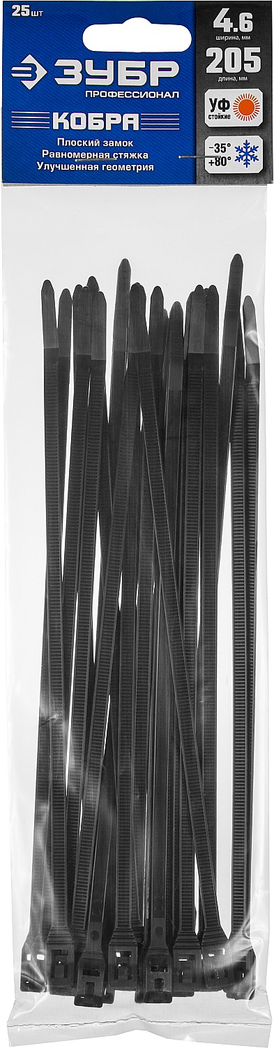 ЗУБР КОБРА, 4.6 x 205 мм, нейлон РА66, 25 шт, черные, кабельные стяжки с плоским замком, Профессионал (30935-46-205)