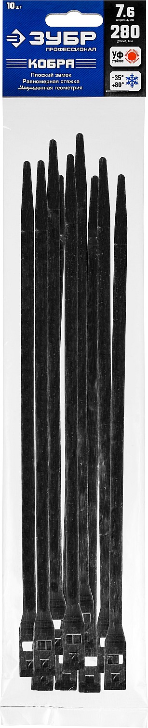 ЗУБР КОБРА, 7.6 x 280 мм, нейлон РА66, 10 шт, черные, кабельные стяжки с плоским замком, Профессионал (30935-76-280)