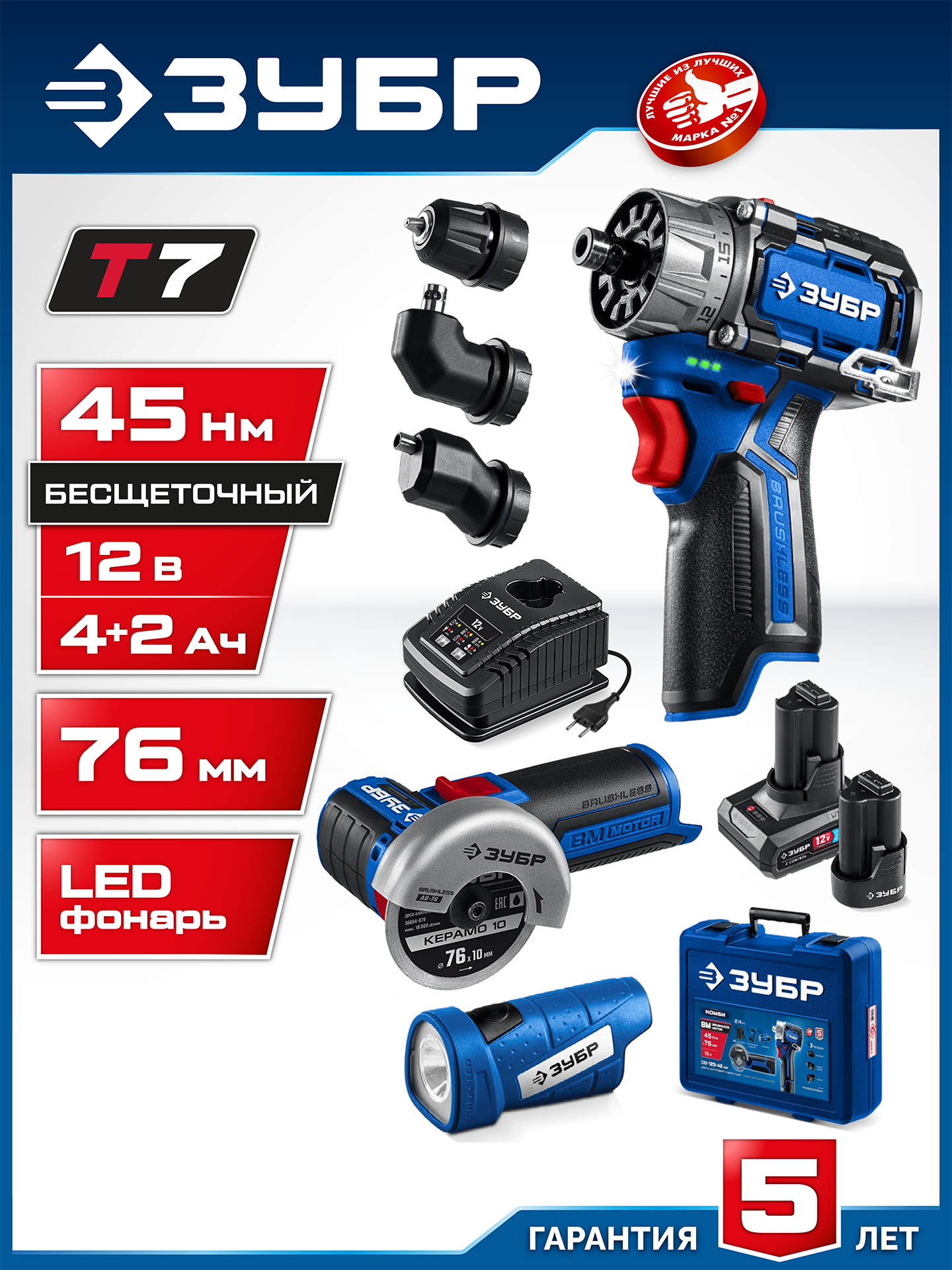 - Набор из дрели-шуруповерта с комплектом сменных патронов для различных работ, углошлифовальной машины для резки и сверхъяркого фонаря