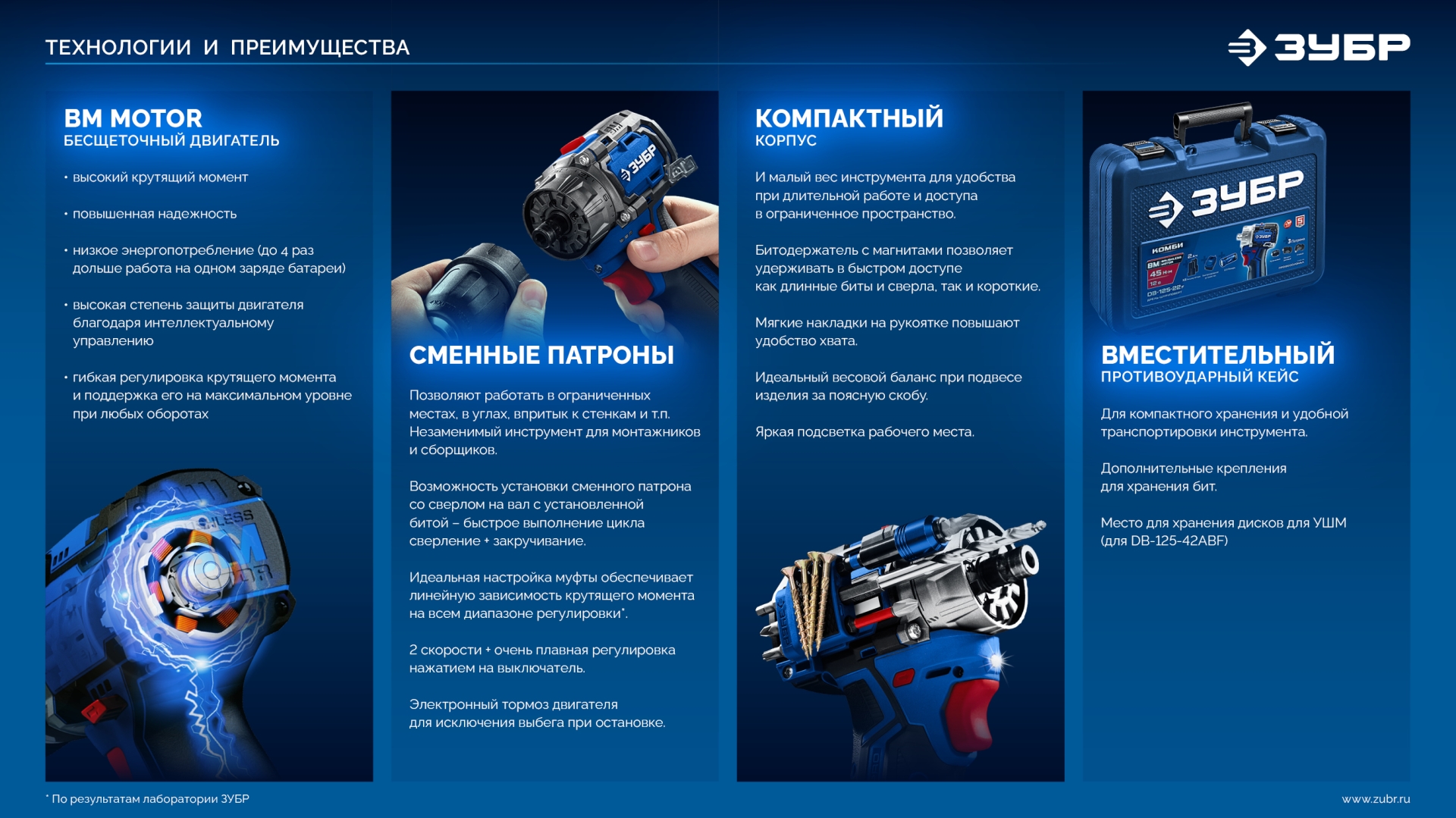 - отсутствие перекоммутаций в коллекторе и, соответственно, отсутствие нагрева и потерь из-за переходных сопротивлений - Z-control интеллектуальная система контроля параметров работы и защиты от перегрузки, перегрева и глубокого разряда