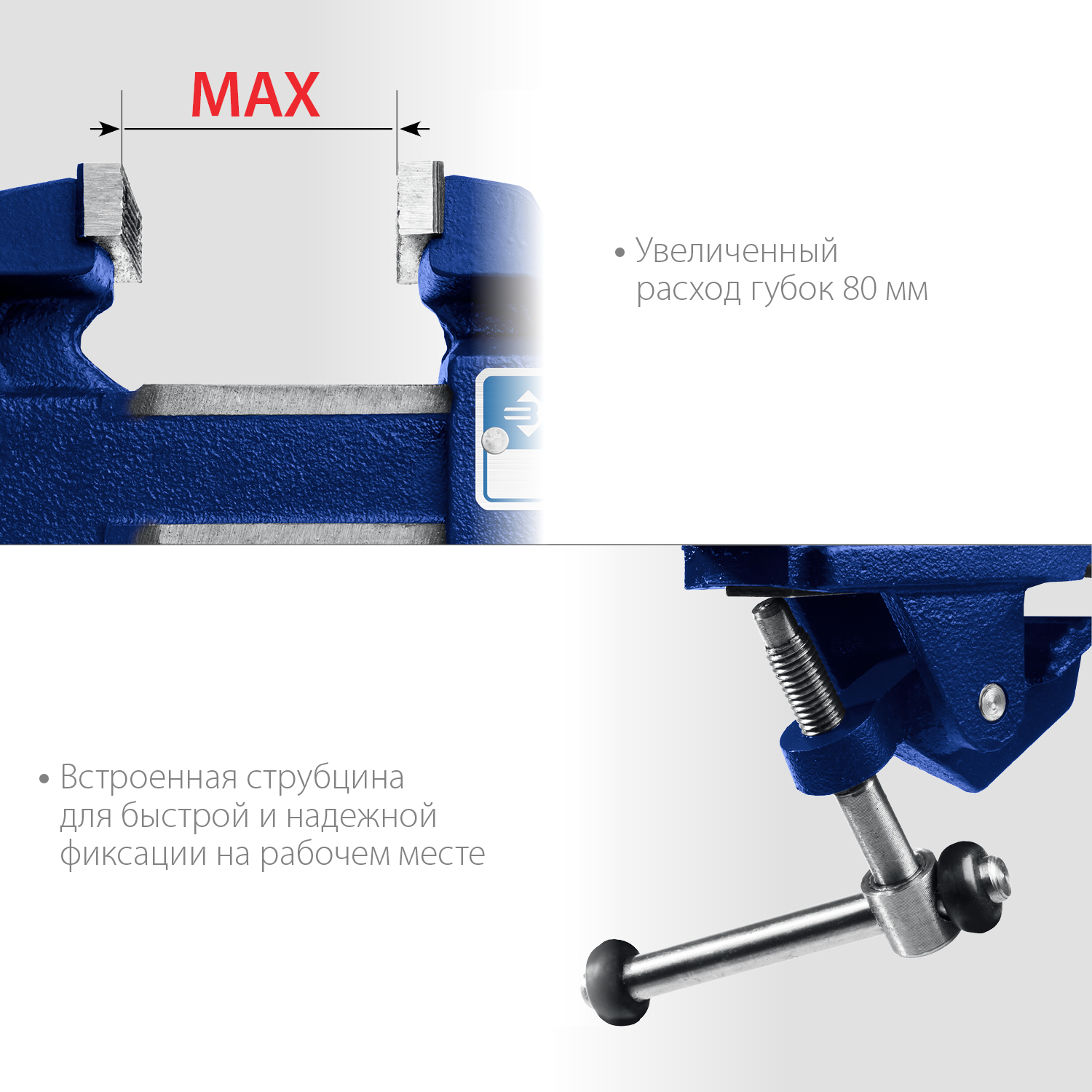 - Встроенная струбцина для быстрой и надежной фиксации на рабочем месте