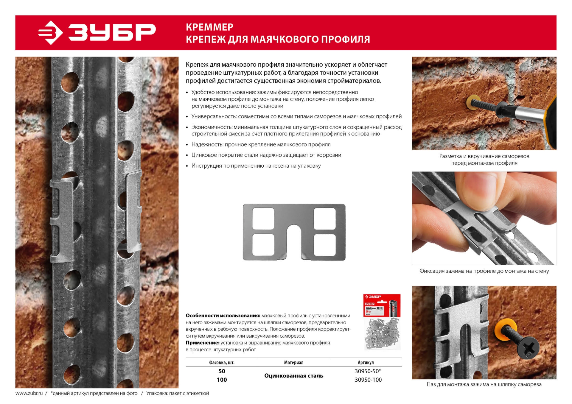 - Удобство использования - крепления фиксируются непосредственно на маячковом профиле до монтажа профиля на стену. Положение маячкового профиля можно легко регулировать даже после его установки.