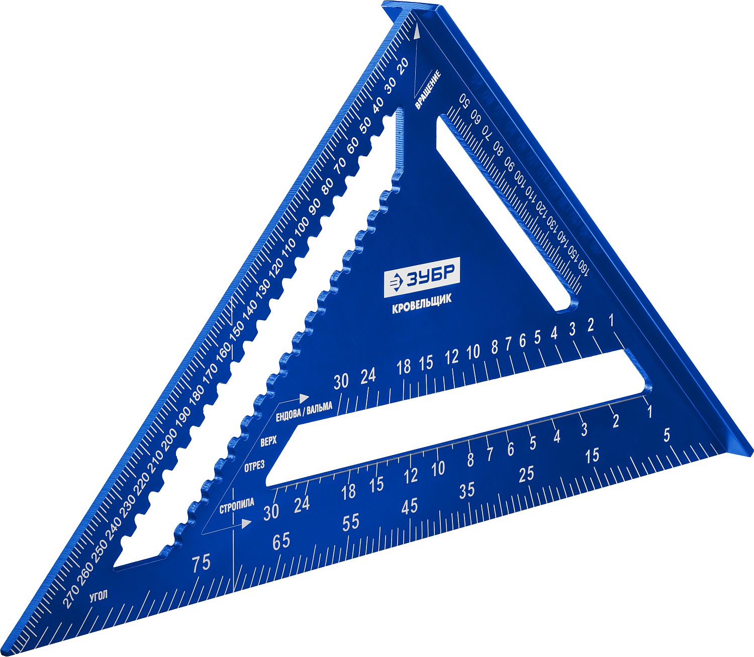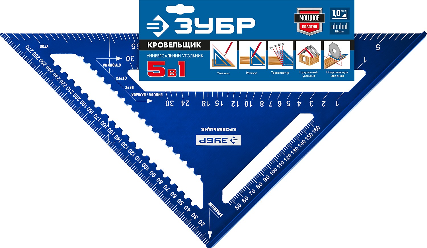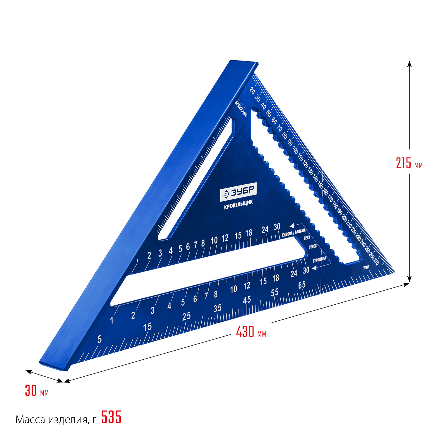 Универсальный большой кровельный угольник инструмент для точного определения расстояния в диапазоне от 0 до 300 мм. Может применяться в качестве торцовочного угольника, транспортира, рейсмуса и направляющей для пилы.