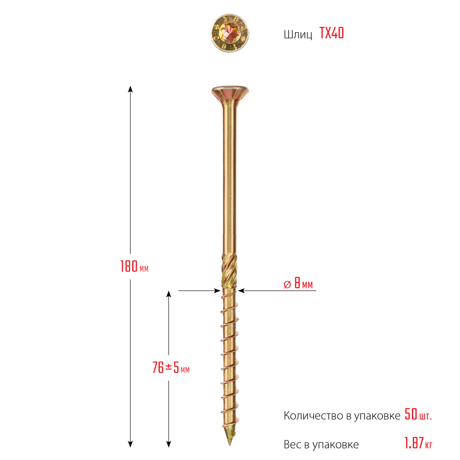 ЗУБР КС-П, 180 х 8.0 мм, TX40, потайная головка желтый цинк, 50 шт (1,84 кг.), конструкционный саморез, Профессионал (30041-80-180)