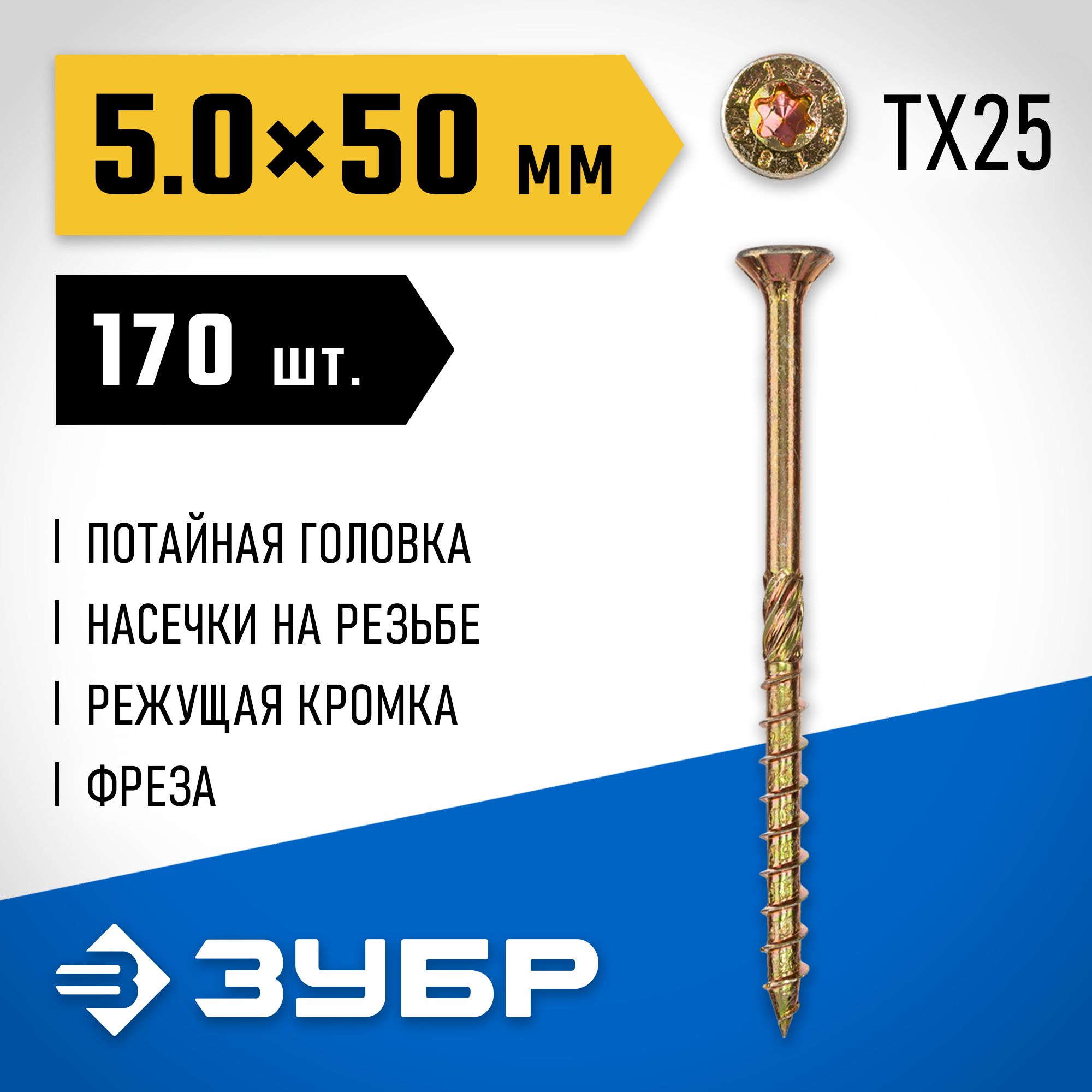 ЗУБР КС-П, 50 х 5.0 мм, TX25, потайная головка желтый цинк, 170 шт (0,66 кг.), конструкционный саморез, Профессионал (30041-50-050)