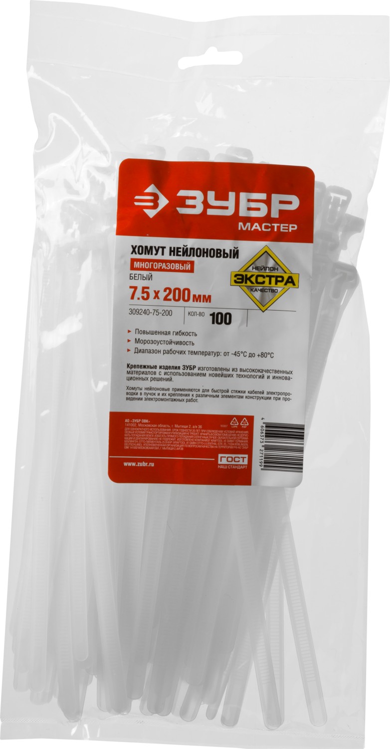 ЗУБР КСР-Б1, 7.5 x 200 мм, нейлон РА66, 100 шт, белые, кабельные стяжки разъемные, Профессионал (309240-75-200)