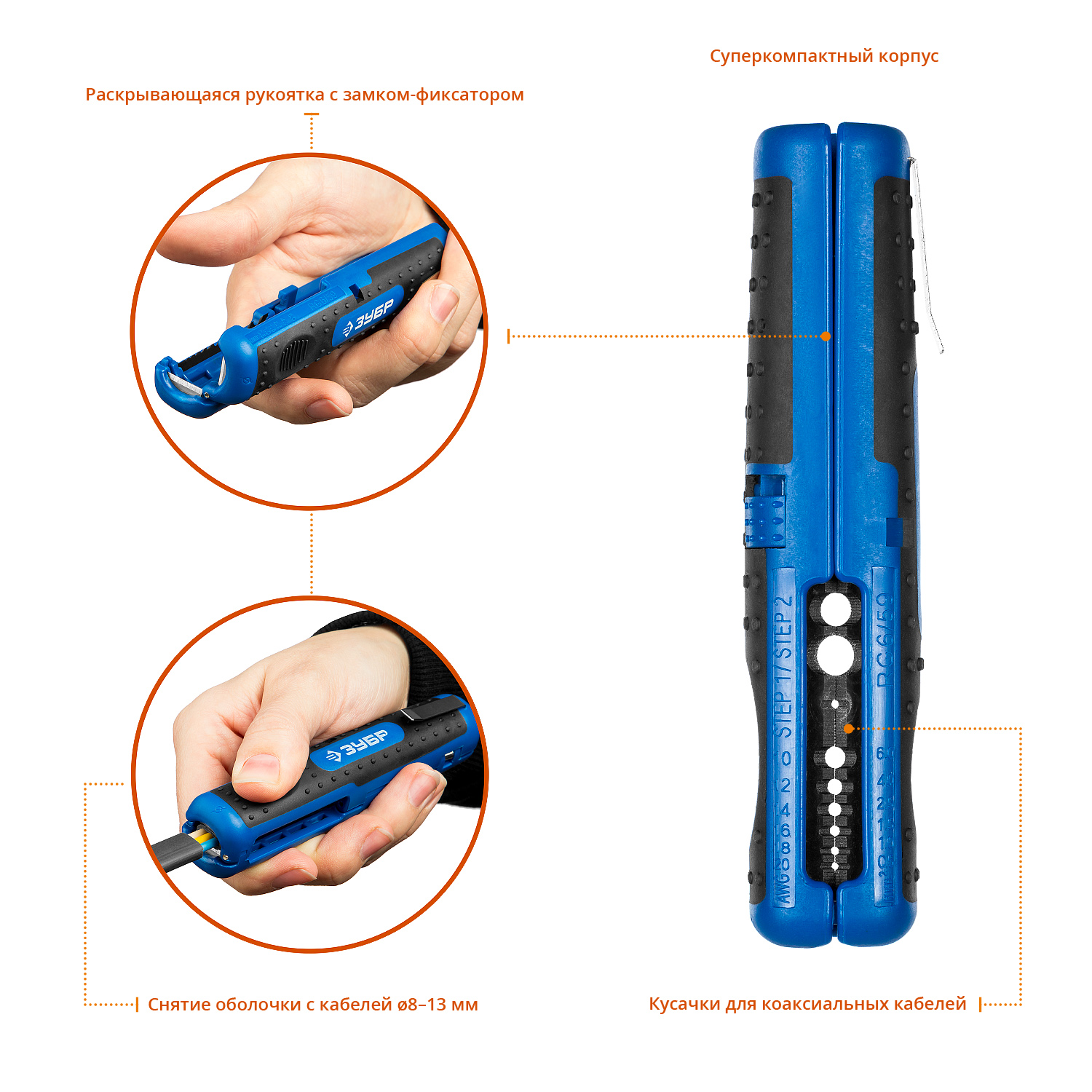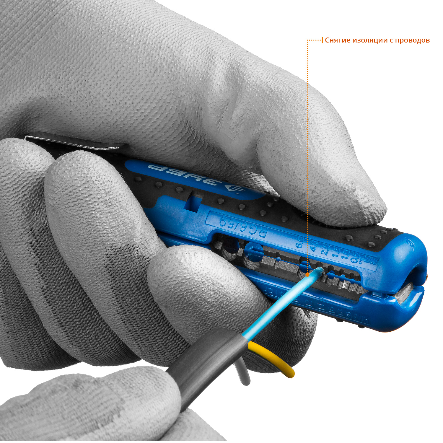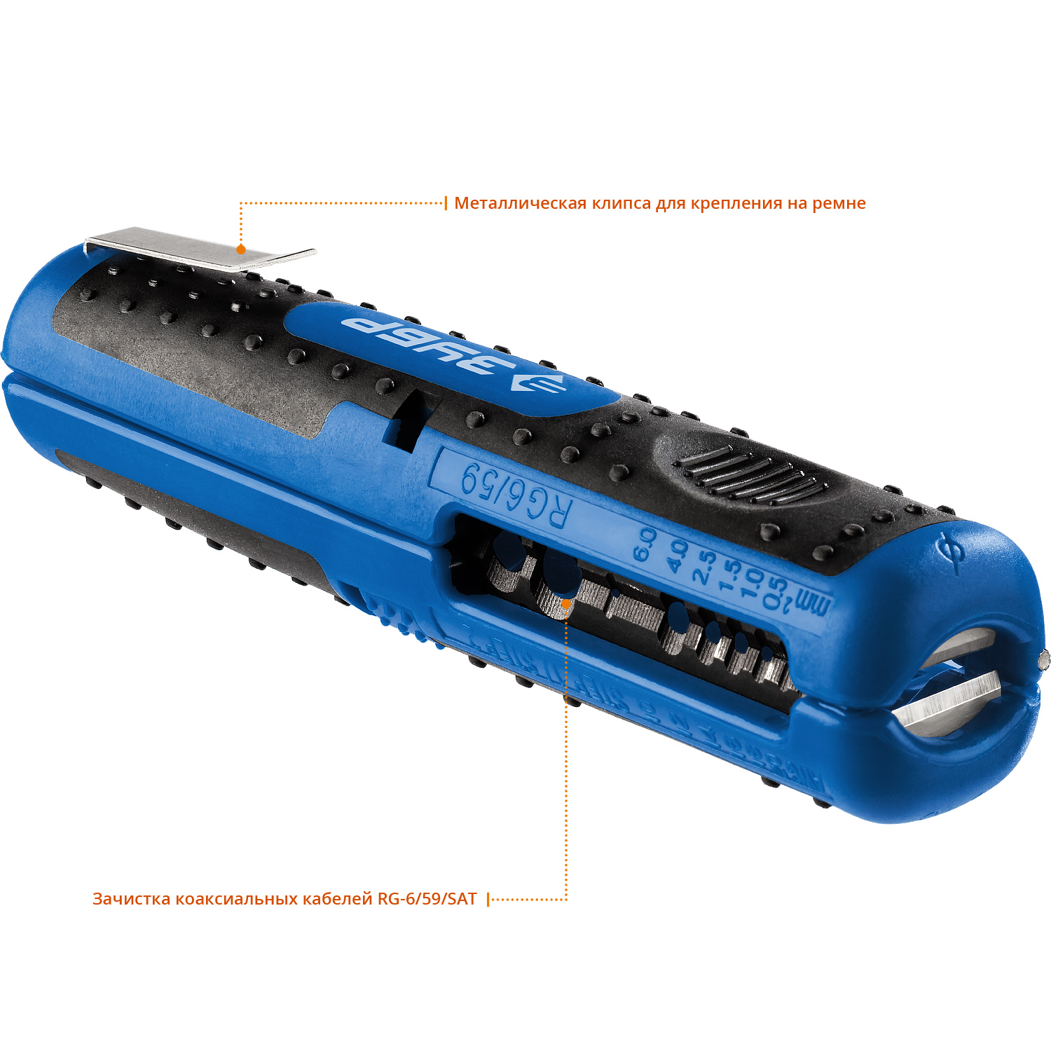 для снятия изоляции и обрезки проводов, зачистки коаксиальных кабелей RG-6/ SAT. RG59