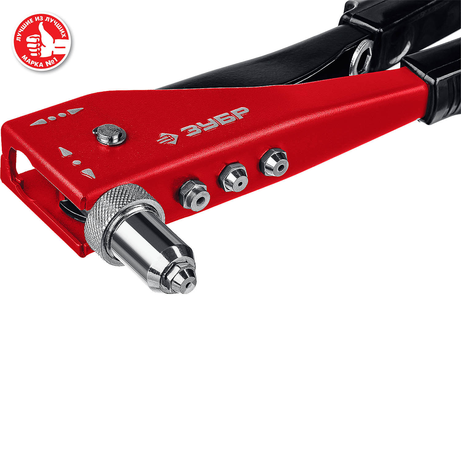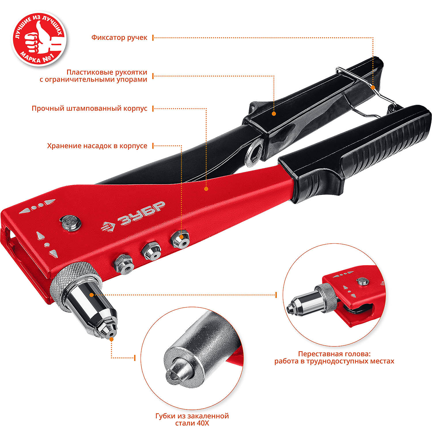 Надежный инструмент для установки вытяжных заклепок. Переставная голова облегчает работу в труднодоступных местах.