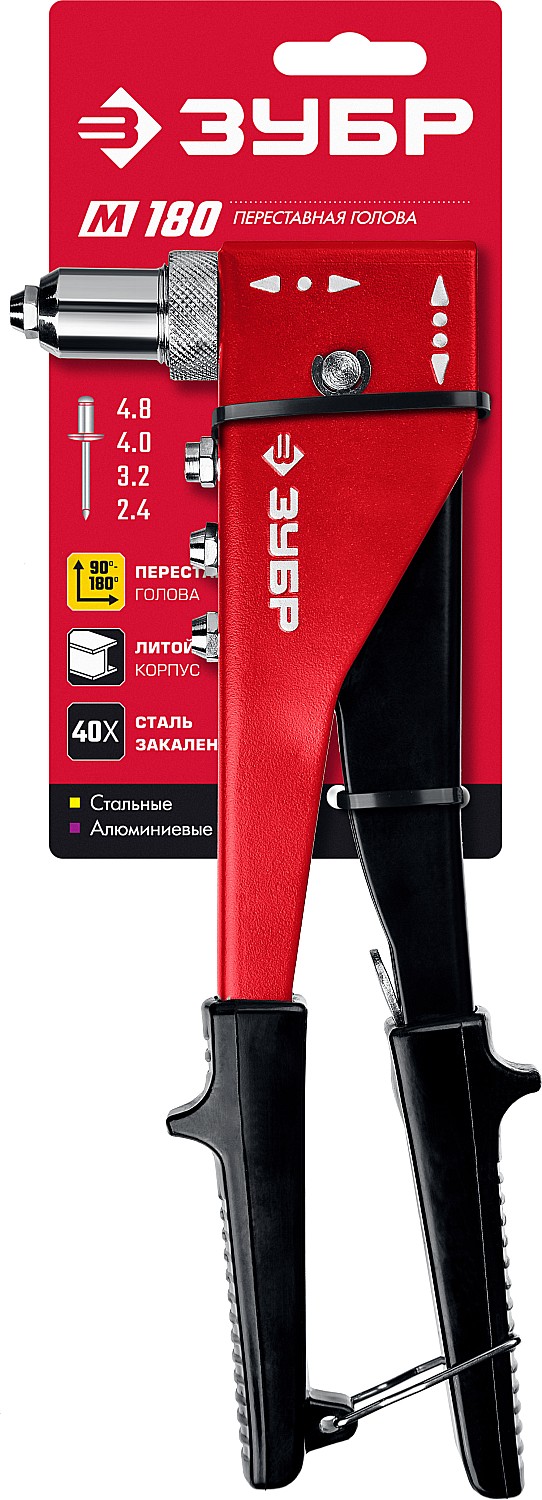 Для установки вытяжных заклепок. Используется с алюминиевыми заклепками диаметром 2,4, 3,2, 4,0, 4,8 мм и стальными заклепками диаметром 2,4, 3,2, 4,0 мм Способ применения: 1. Просверлите отверстие 2. Установите заклепку в заклепочник 3. Сжимайте рукоятки заклепочника до момента откусывания хвостовика заклепки 4. Заклепка установлена