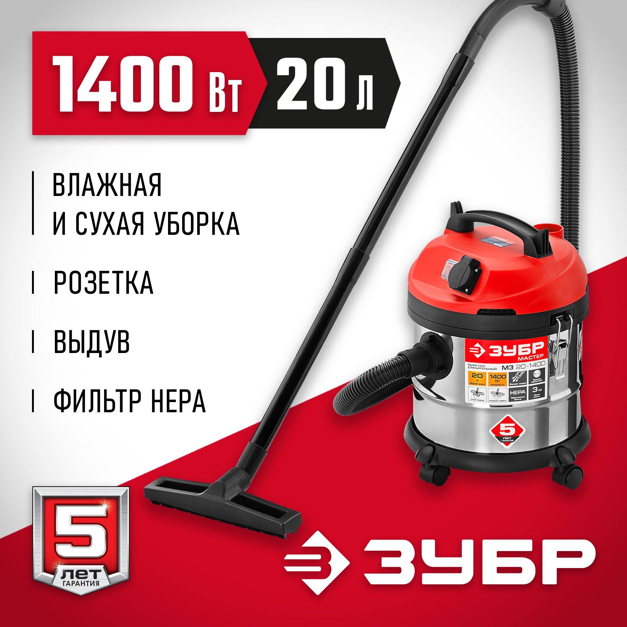Строительный пылесос ЗУБР предназначен для уборки помещений, а также для принудительного удаления продуктов пиления, строгания, фрезерования и т.п. из рабочей зоны электроинструмента. Он незаменим для поддержания чистоты в гараже, мастерской, удаления мусора во время ремонта в квартире или на даче. Бак из нержавеющей стали объемом 20 л очень долговечен. а синхронное включение с инструментом, подключенным через розетку пылесоса позволит сохранить чистоту на рабочем месте.