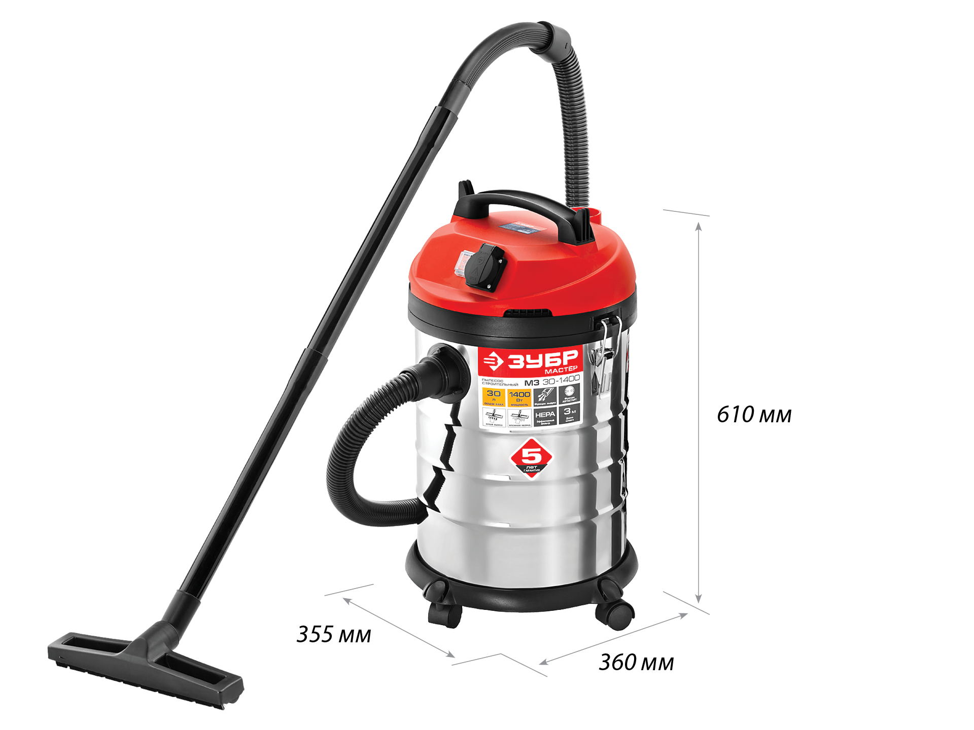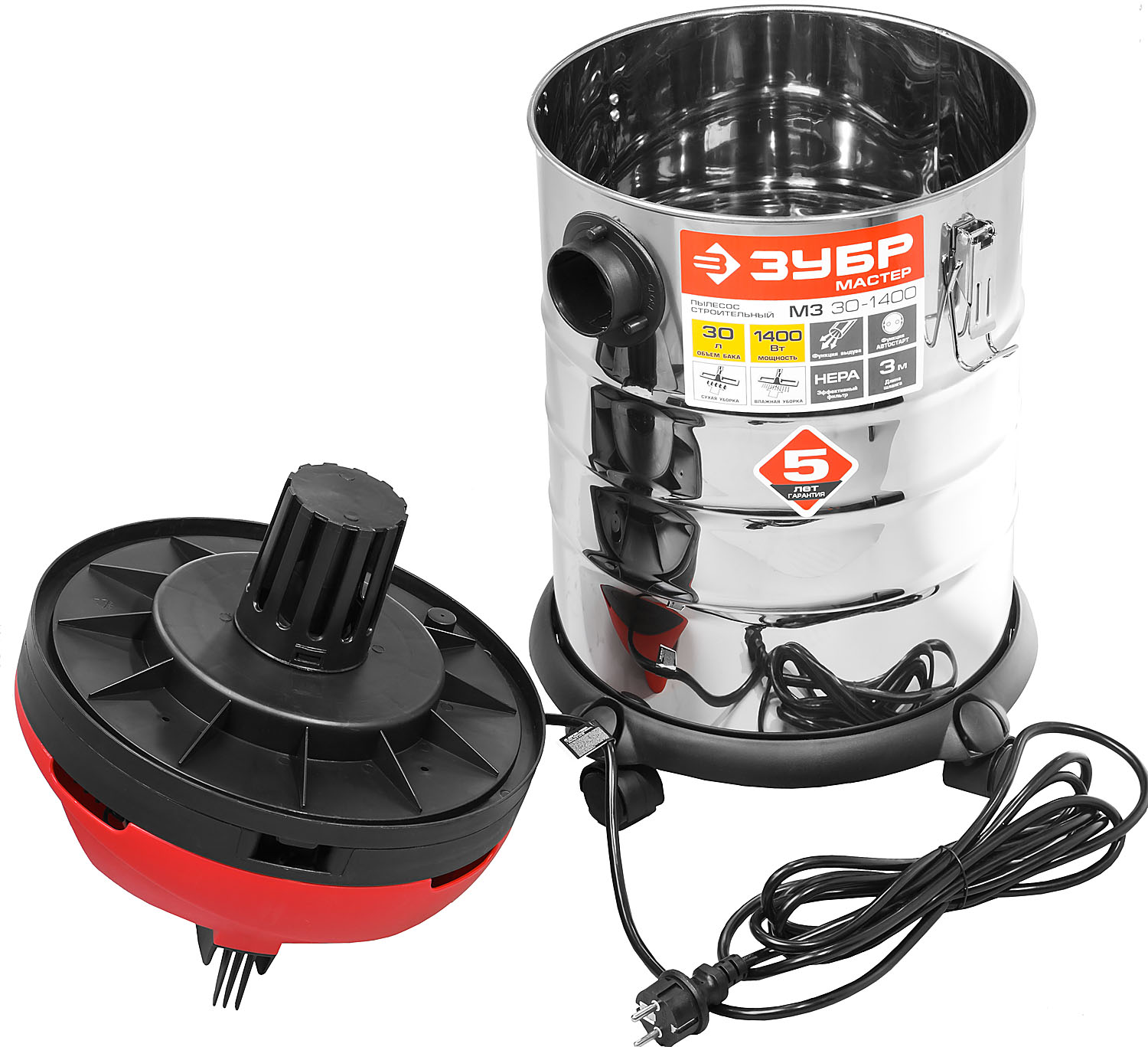 Строительный пылесос ЗУБР предназначен для уборки помещений, а также для принудительного удаления продуктов пиления, строгания, фрезерования и т.п. из рабочей зоны электроинструмента. Он незаменим для поддержания чистоты в гараже, мастерской, удаления мусора во время ремонта в квартире или на даче. Бак из нержавеющей стали объемом 30 л очень долговечен. а синхронное включение с инструментом, подключенным через розетку пылесоса позволит сохранить чистоту на рабочем месте.