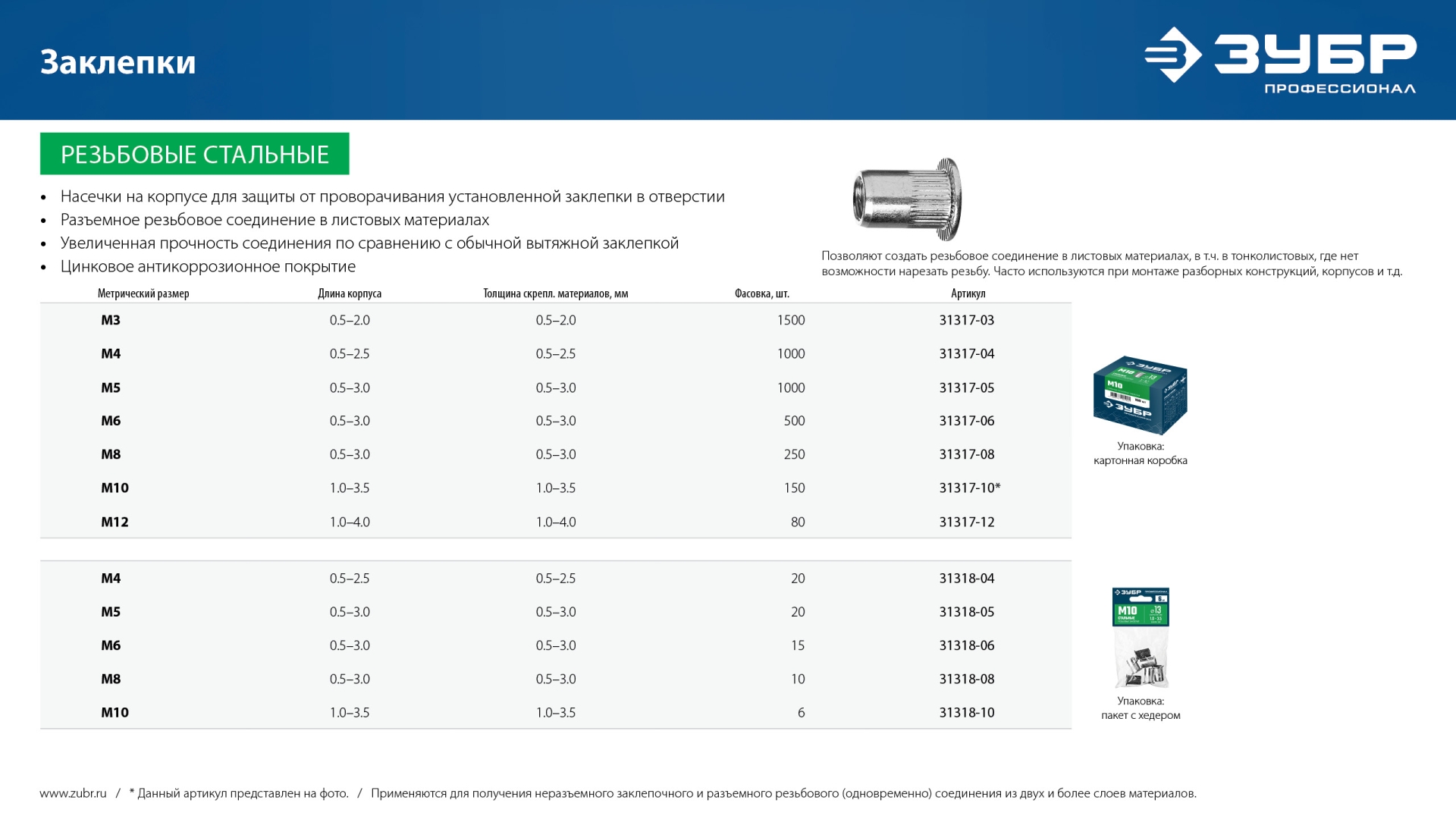 Для получения неразъемного соединения повышенной прочности из двух и более слоев материала с созданием разъемного резьбового соединения. Установка заклепок производится с помощью резьбового заклепочника.