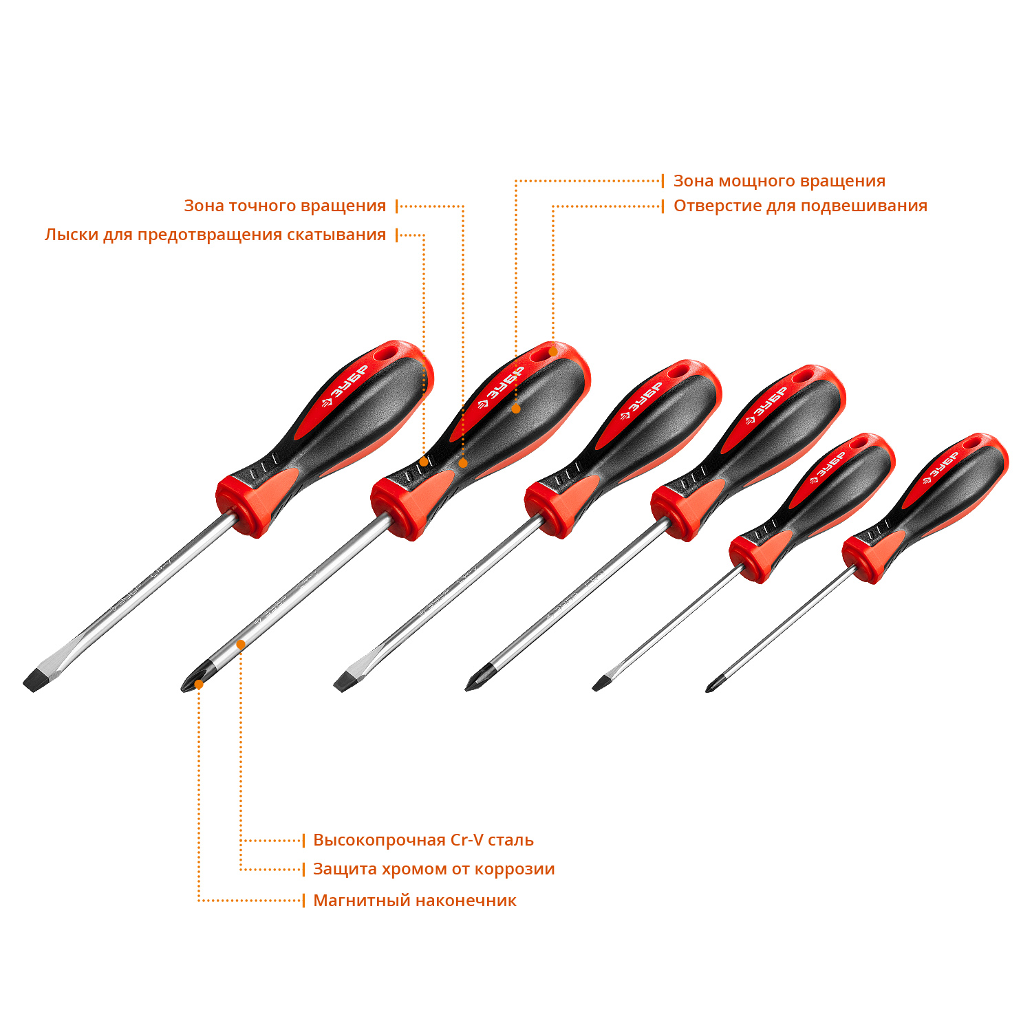Отвертки выдерживают высокие нагрузки, благодаря высококачественной хромованадиевой стали, закаленной по особой технологии. Двухкомпонентная рукоятка обеспечивает надежный хват и удобство работы