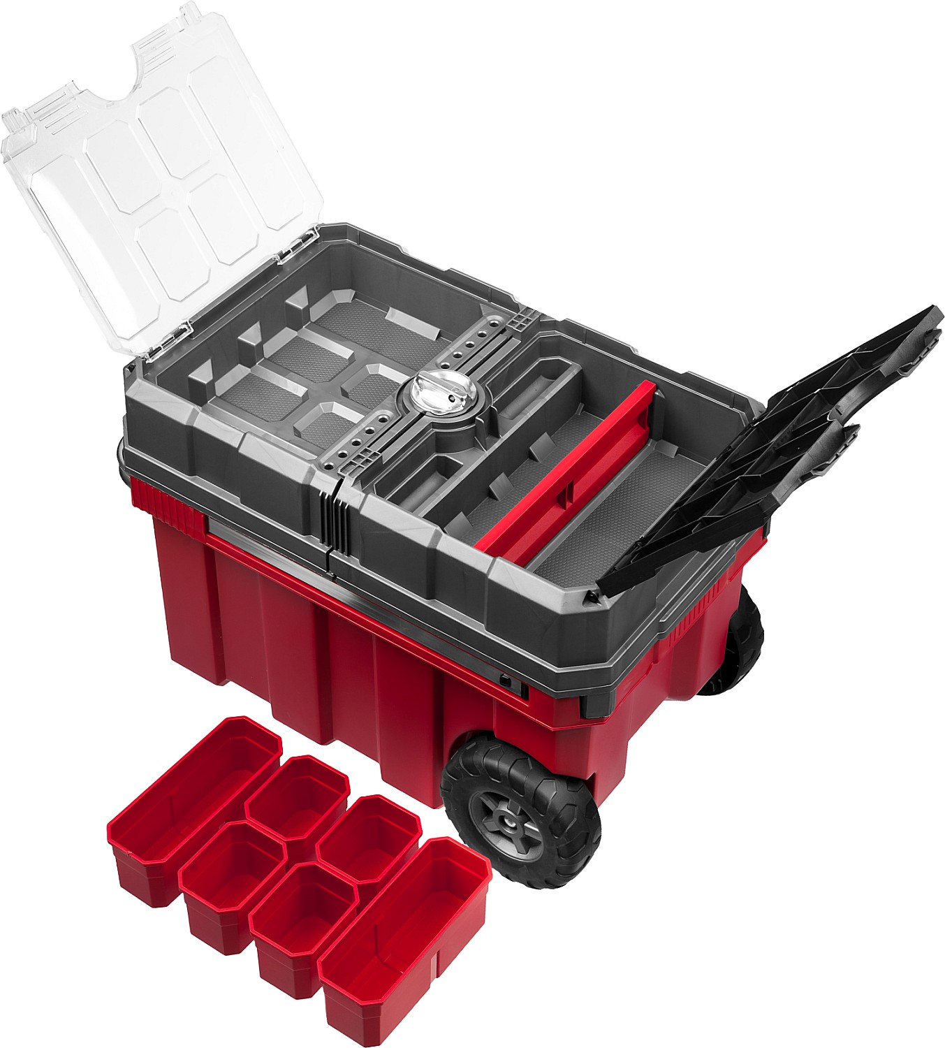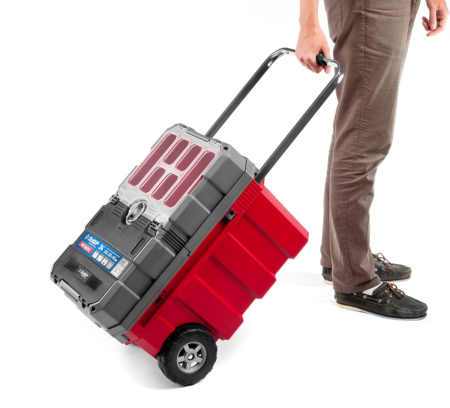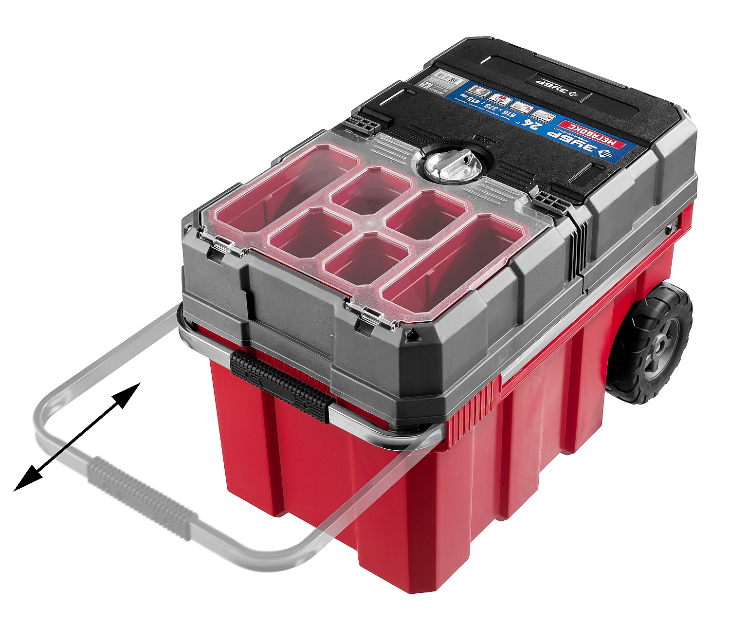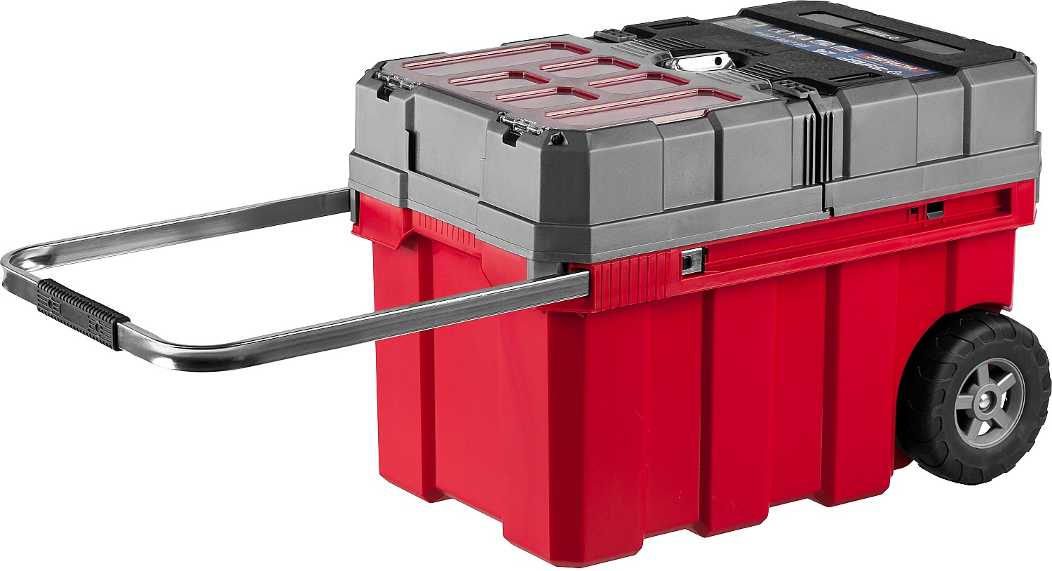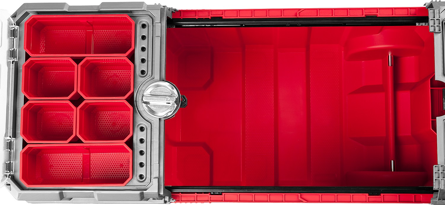 Объем этого ящика позволяет вместить в него большое количество инструментов, удобно разложить их благодаря съемной полке и легко перемещать при помощи встроенных колес и раздвижной ручки.