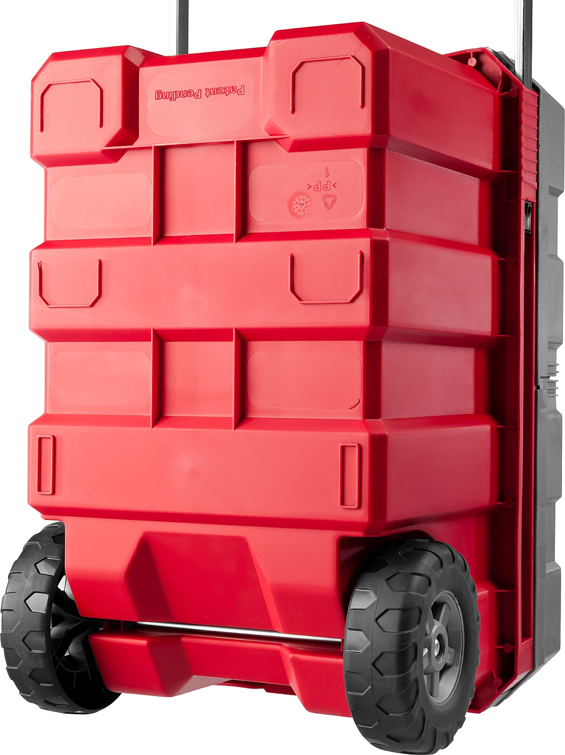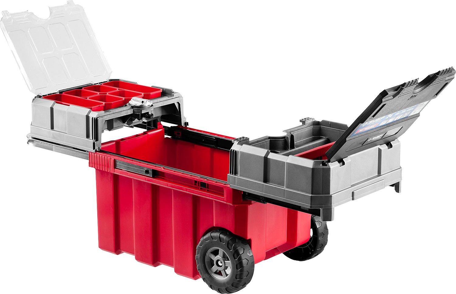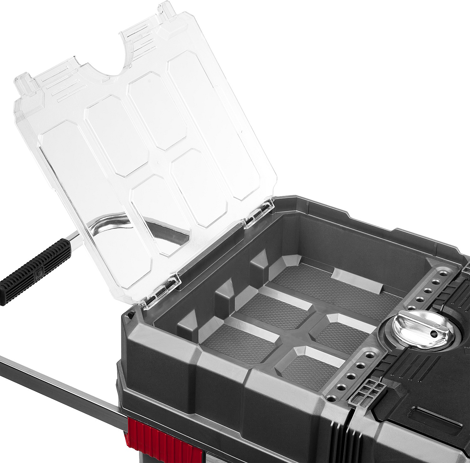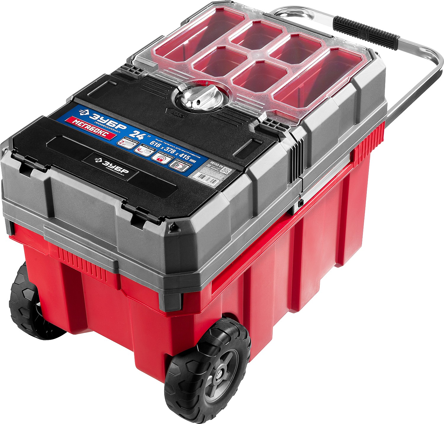 Объем этого ящика позволяет вместить в него большое количество инструментов, удобно разложить их благодаря съемной полке и легко перемещать при помощи встроенных колес и раздвижной ручки.