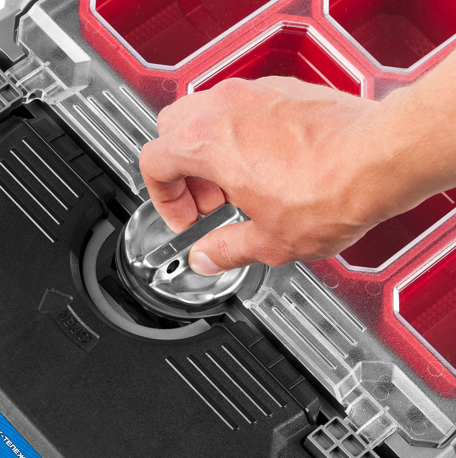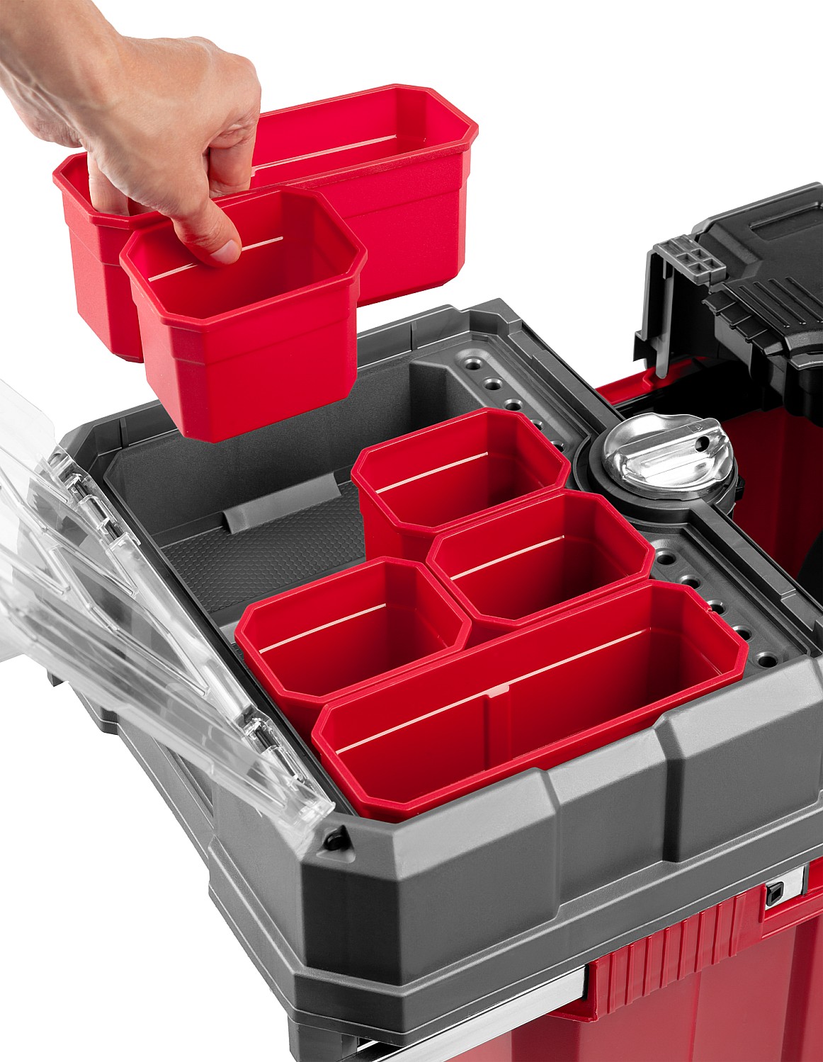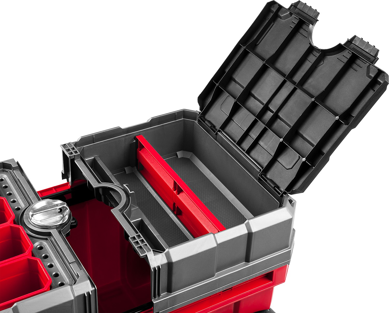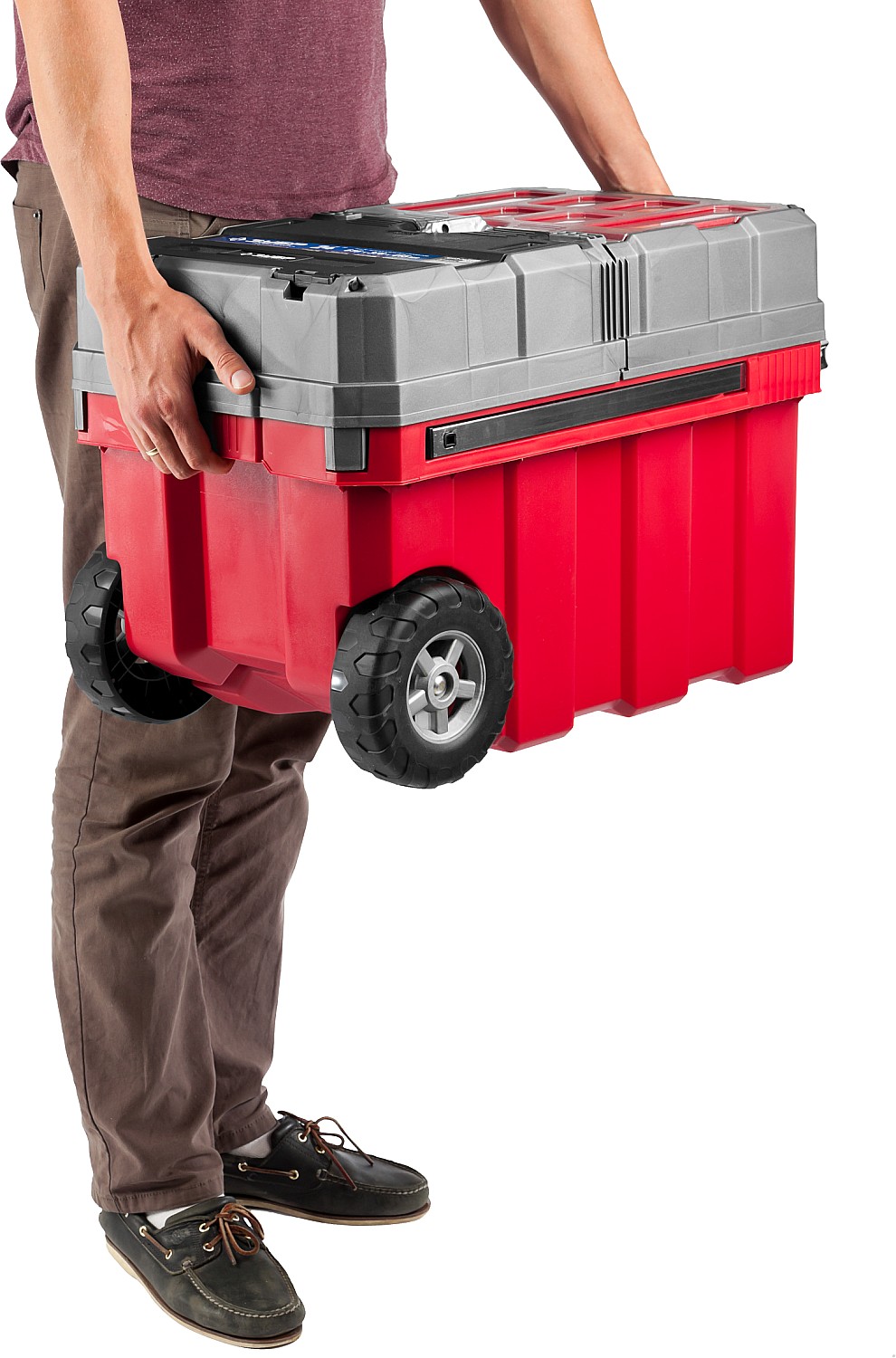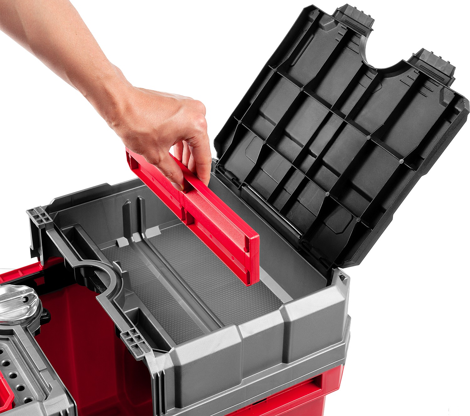 Объем этого ящика позволяет вместить в него большое количество инструментов, удобно разложить их благодаря съемной полке и легко перемещать при помощи встроенных колес и раздвижной ручки.